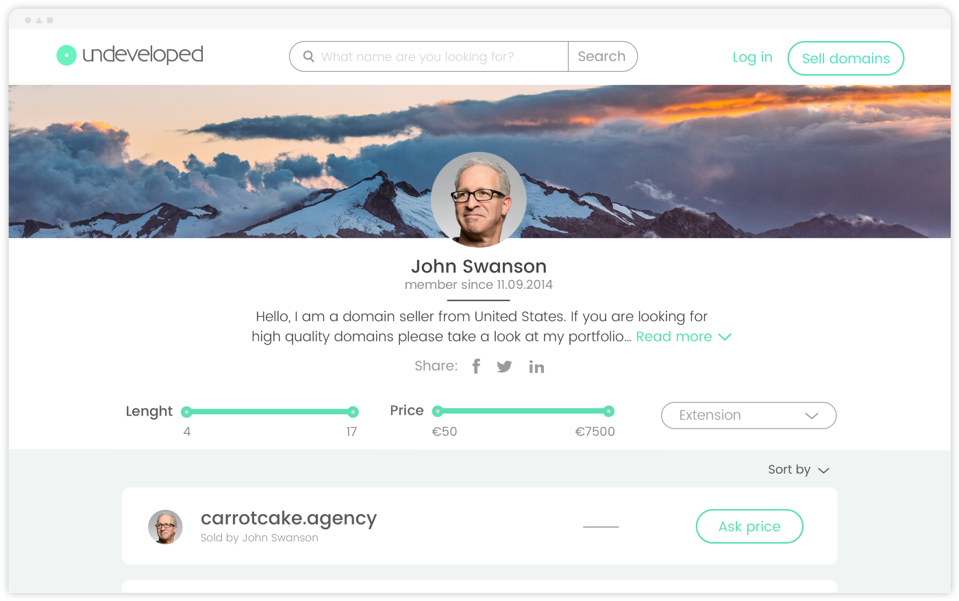 2. Business model: No ads, the most important thing to us is that domains move from seller to buyer. We believe that ads get in the way of that mission. Instead, Undeveloped focuses on providing the best possible user experience and facilitating domain acquisitions. And our business model follows this line of thought: you only pay (as a seller) when a transaction is conducted successfully.