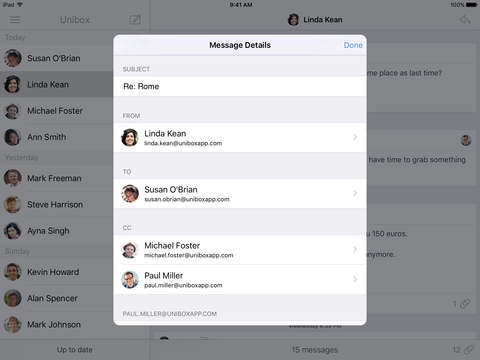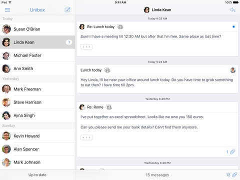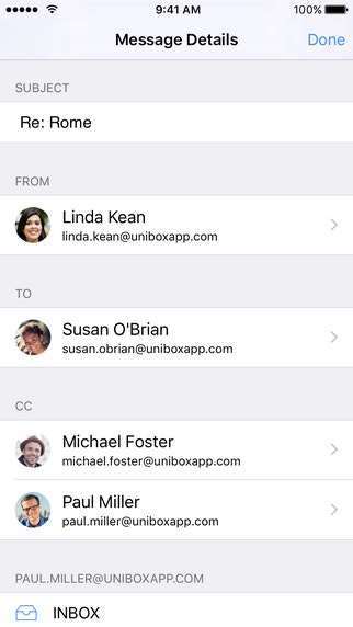 Unibox is the perfect email client. To me is a game changer, what I love the most of it is that the App organize my emails based in a PEOPLE CENTRIC concept,so when the user receives an email and clicks on it, he can see the email thread that he was exchanging with that specific person over the years, which is very helpful to keep everything organized. You c… See more