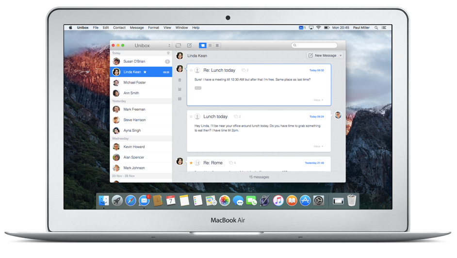 Recently there have been many attempts to get ever growing inboxes under control. With Unibox we introduce a very unique, yet very simple solution to this problem by grouping emails by sender, meaning that every sender appears only once in the inbox overview.