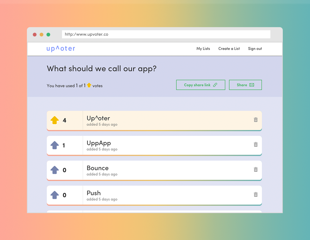 Great product, I've been looking exactly for something like this for so long, I was tempted to make it myself :P A few observations though (although I'm sure its still early and you've got these things planned out). 1. I can't down vote. 2. I can't edit my list to change its settings. 3. I can't delete lists.