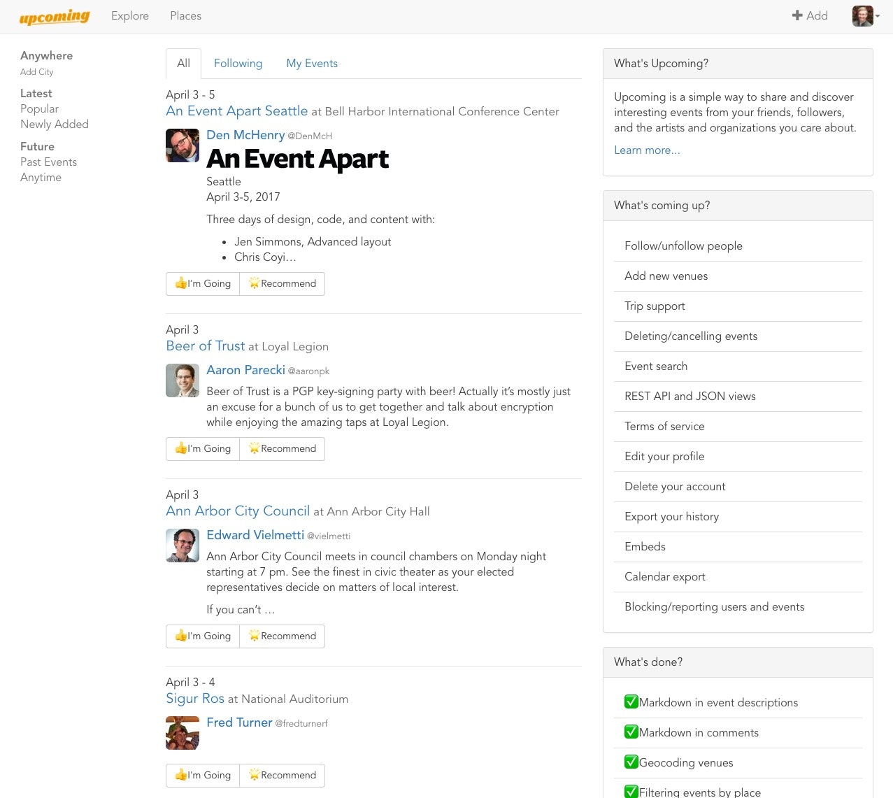 Fourteen years in the making — after an acquisition by Yahoo, followed by its sunsetting years later — Upcoming is finally back, after a successful Kickstarter in 2015. Yes, I'm a little more than nostalgic to see Upcoming return, but this time I'm hopeful that @waxpancake will take the helm of the project, now that his other efforts are behind him, and brin… See more