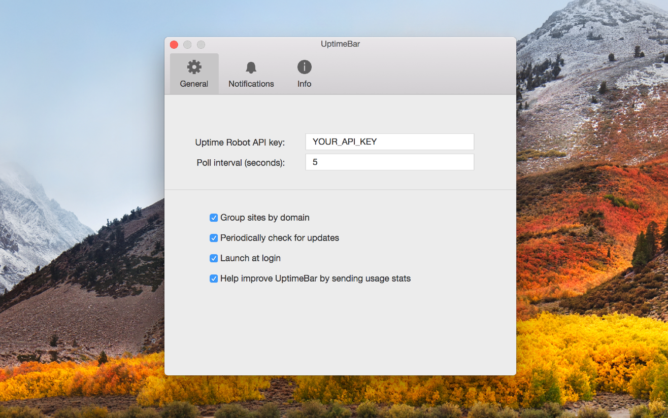 UptimeBar is a simple OS X menu bar app that notifies you if any of your websites are down. It connects to the UptimeRobot API to get up to date information every few seconds.