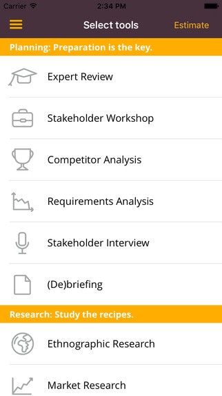 This app will be great to use for me for next time I hire design. It helps to assess what to include and not, and talk the same language as designers. It would be good to have some more functionality in the result sections, for instance to evaluate and compare different combinations.