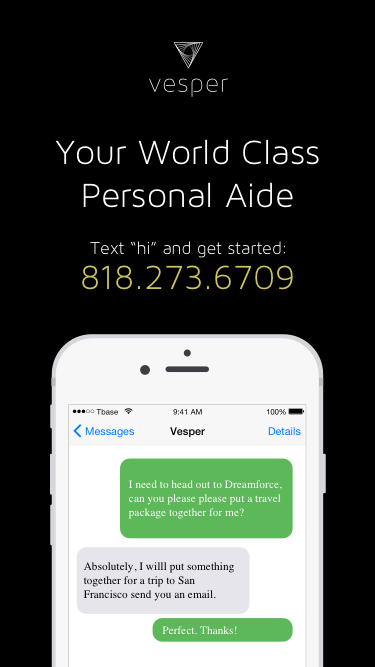 Vesper is your world class personal aide. It is a part man, part machine assistant that helps you manage the logistics of your business.