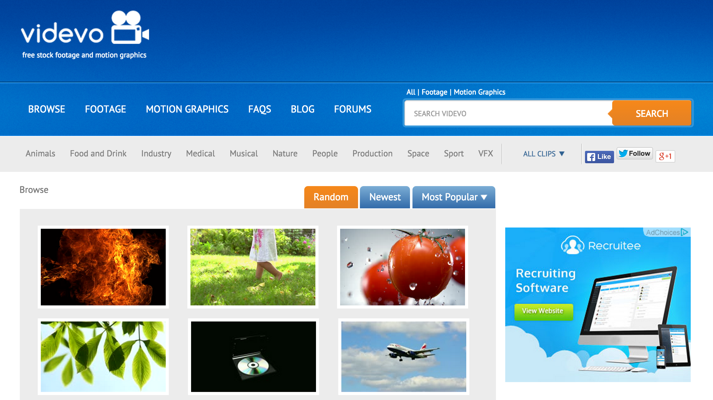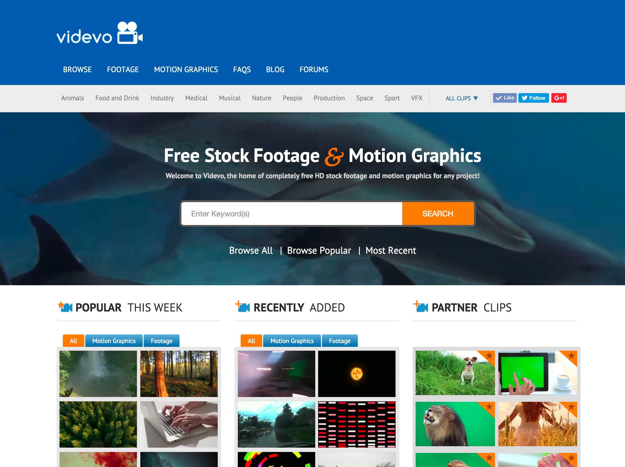As the title says Videvo offers free stock footage and motion graphics for use in any project. Everything on the site is HD, and we currently have just short of 3000 clips on the site. In future we plan to add 4K content.