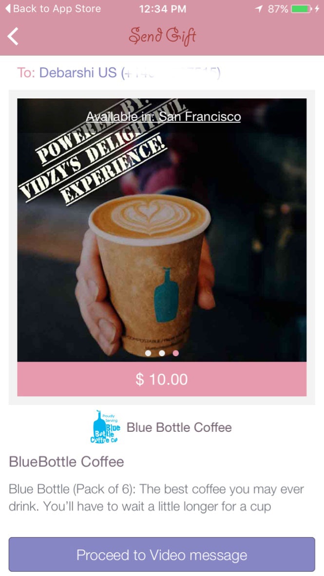 Using Vidzy you can send casual, on-demand gifts to your friends, colleagues and loved ones everyday. For e.g. Send a coffee, without knowing giftee's address of coffee preferences, and they will deliver the perfect coffee which the giftee likes at her doorstep.