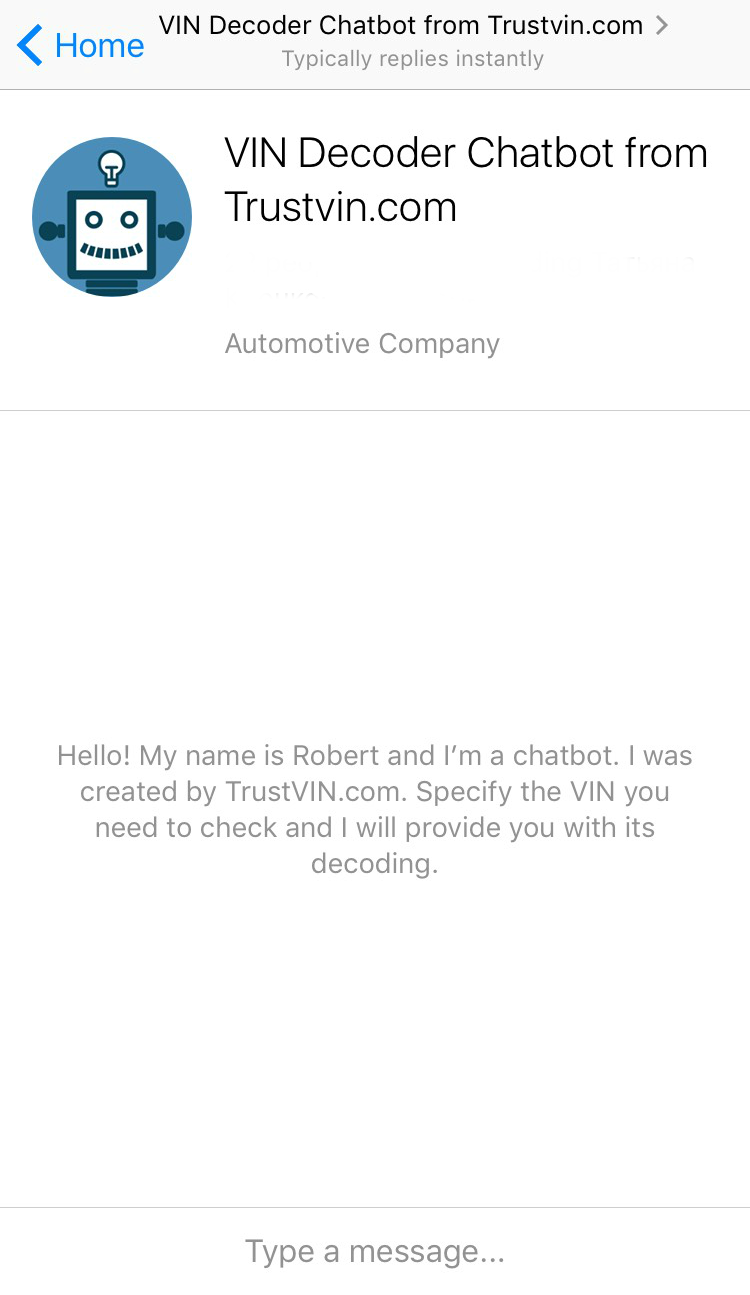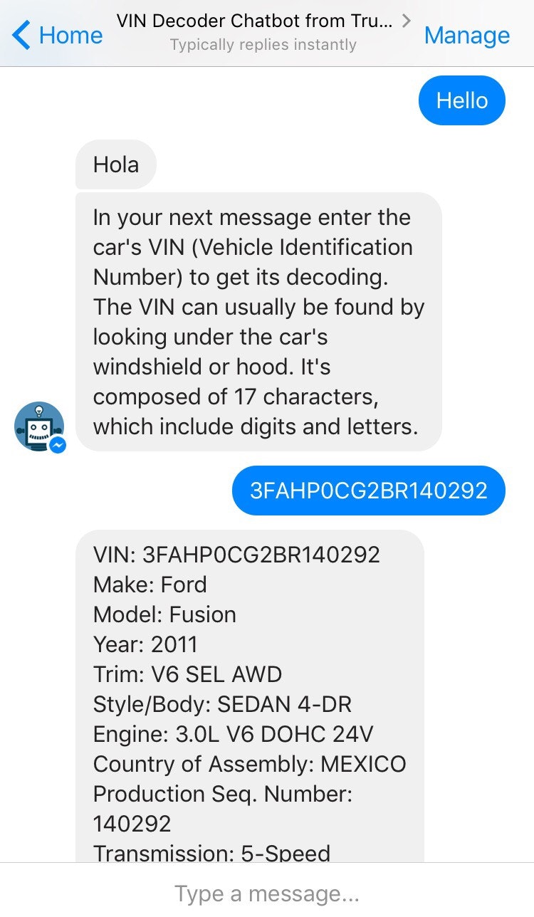 Free VIN Decoding bot in Facebook Messenger. Robert decodes any model VIN of US market vehicles, and sends you general information about the vehicle you want. Just enter the vehicle’s VIN in a message window, and get info on its technical parts.