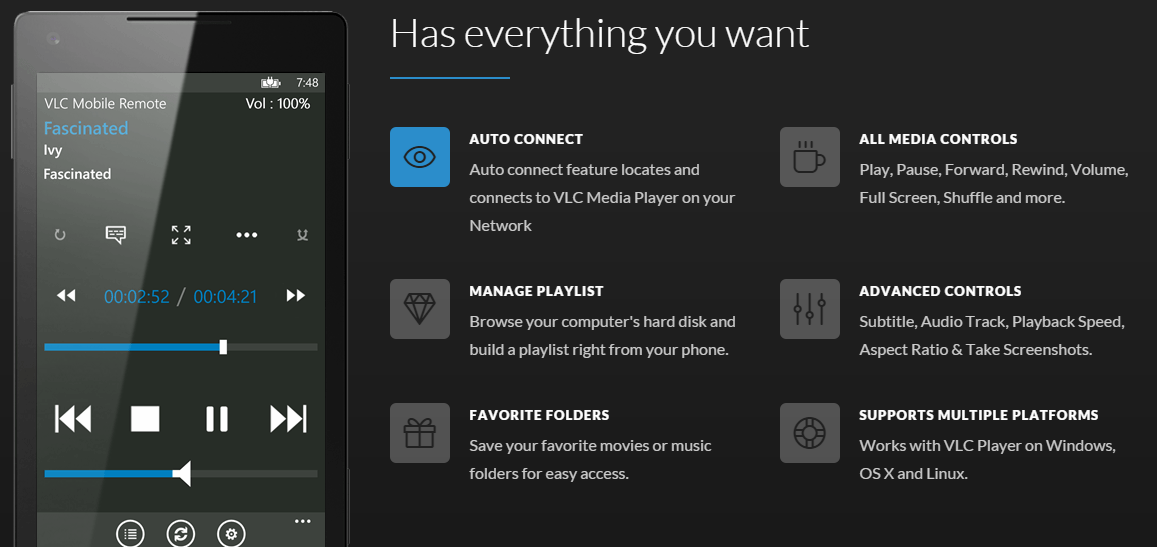 Avoid hunting around for your keyboard when you're watching a movie in the dark. With VLC Mobile Remote, you can turn your phone into a remote control for VLC media player on your PC or Mac. Control playback, volume, aspect ratio, and more – basically making your computer and phone work like a TV.