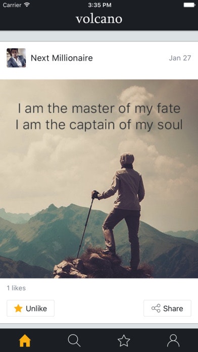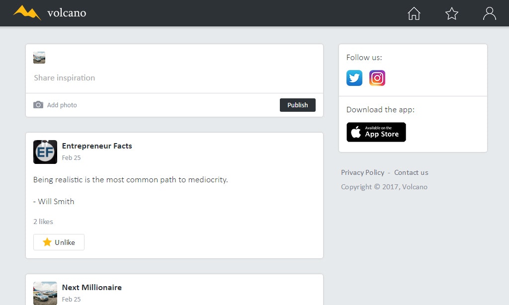 Volcano is a social platform for sharing motivation and inspiration. It helps users to be inspired by reading quotes, motivational posts and articles. Volcano also enables users to share motivational content in the form of quotes, images and links. The goal of Volcano is to help users to discover their greatness by gathering and providing all motivational materials in one place.