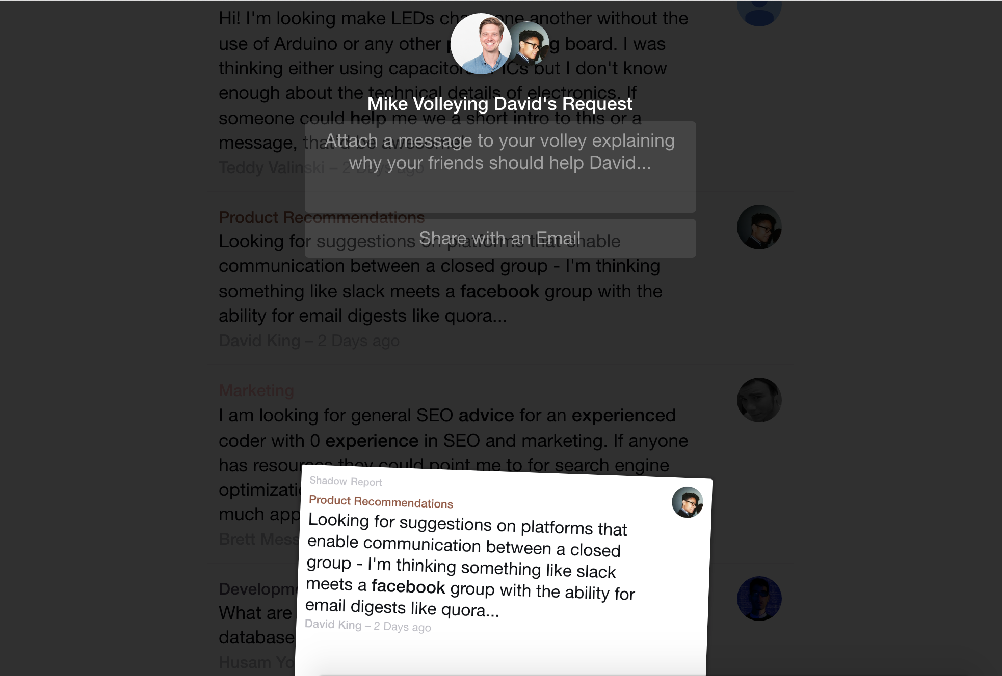 Been using volley for a few weeks and I've found the 2nd, 3rd + degree connections very helpful. It's similar to Quora but I think the private reply feature makes conversations much more personable. Really impressed by the quality of replies I've received on Volley. All the best!