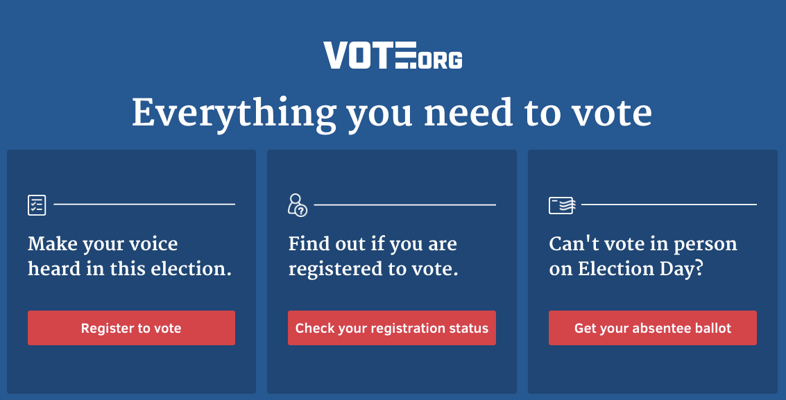Vote.org is a non-profit that wants to get the US to 100% voter turnout. They're building tech that removes barriers to voting. On Vote.org, you can register to vote, check your voter registration status, or get an absentee ballot. And they're in the S16 batch of YC!