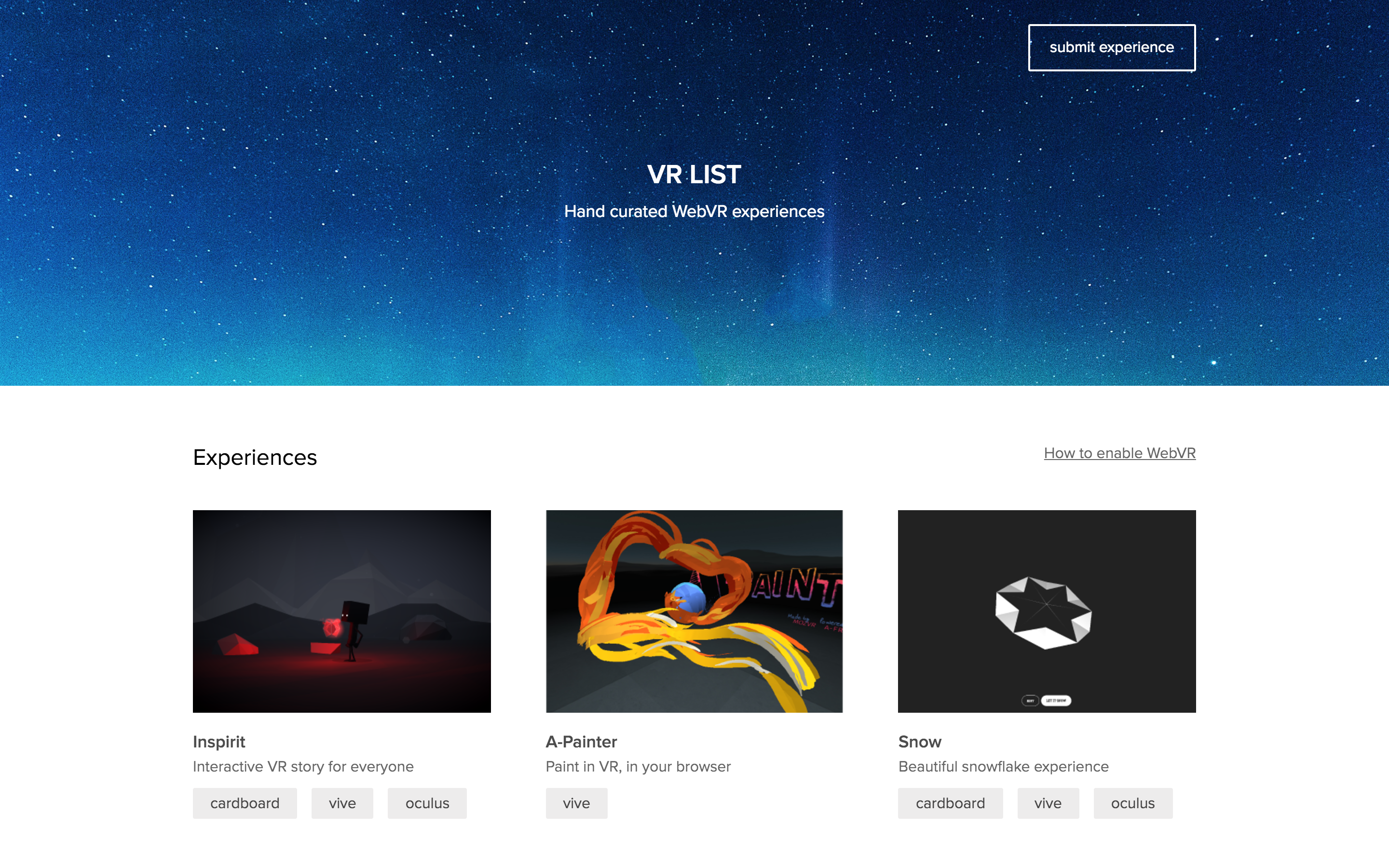 Today I wanted to share with you a weekend project. VRList is a hand curated list of WebVR experiences. Not everyone is familiar with WebVR so I wanted to help introduce the community to it.