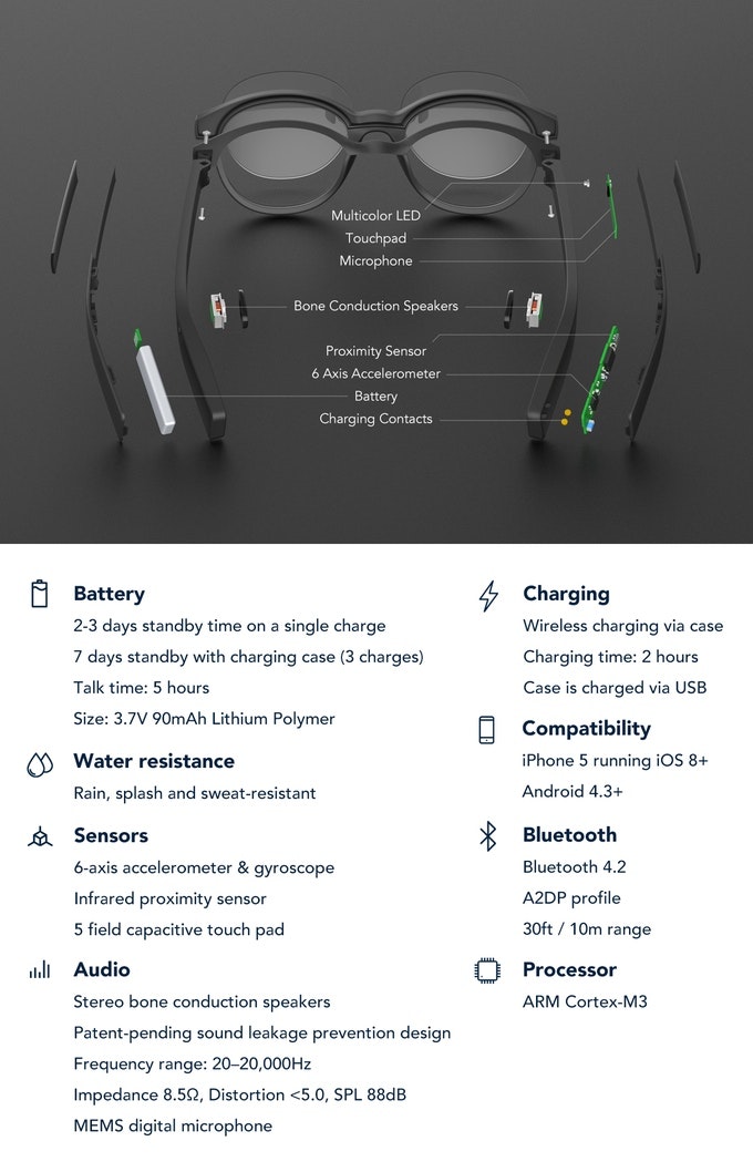 Really interested in how the quality of the audio is going to be. On the Kickstarter page there's also a video where the prototype is shown, and it seems that when Aaron puts the glasses back on is own head the sound is still picked-up by the camera. Which means that when I'm playing music on my Vue, people around me will also enjoy my great music taste (wh… See more
