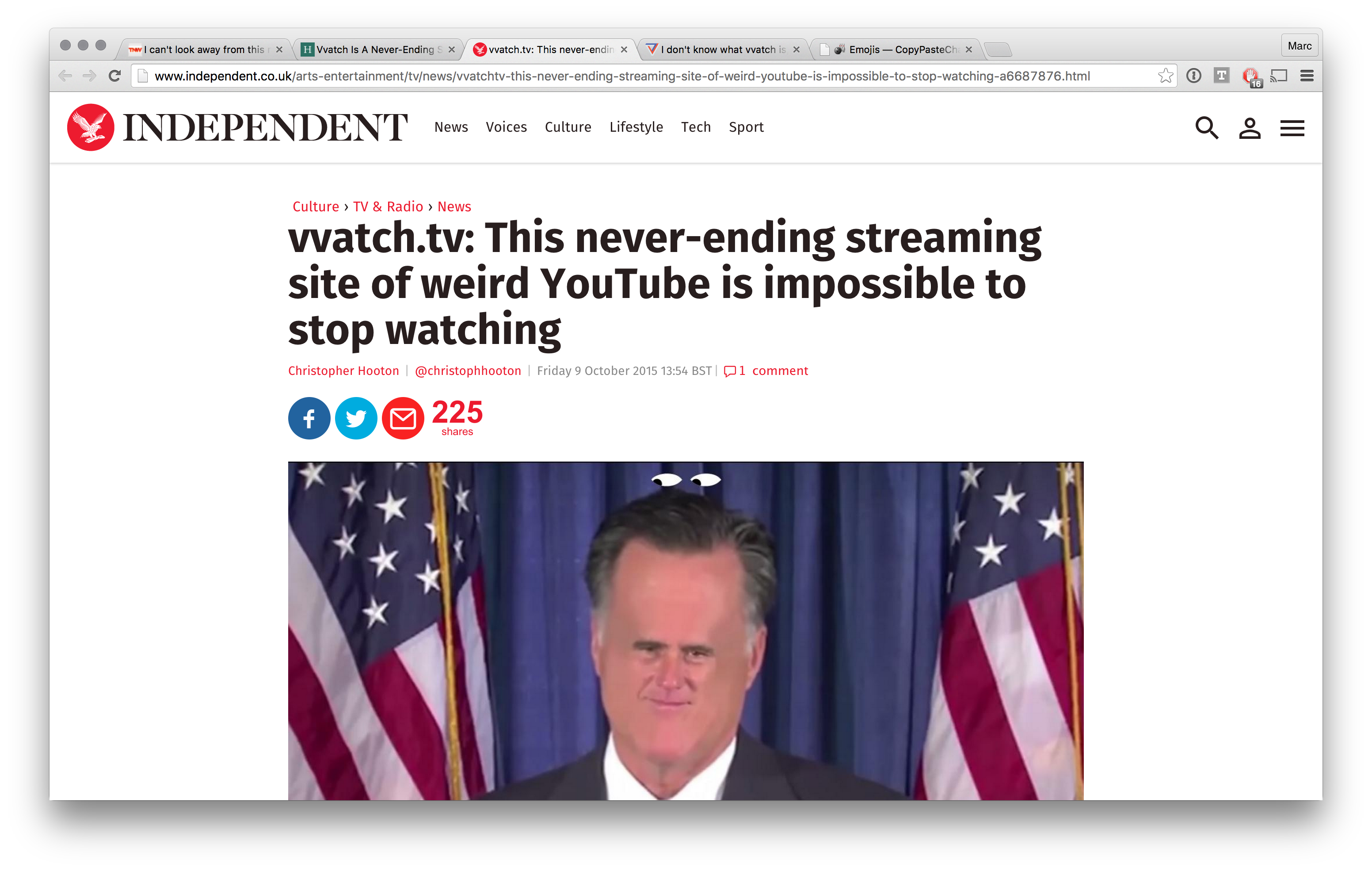 Love the attention to detail. I like how the favicon updates :) very nice work. I can see this blowing up, but you need a wider variety of channels! As a user, I want to be able to make my own channels so I can watch content that I'm interested in. Maybe let users enter a few #keywords?