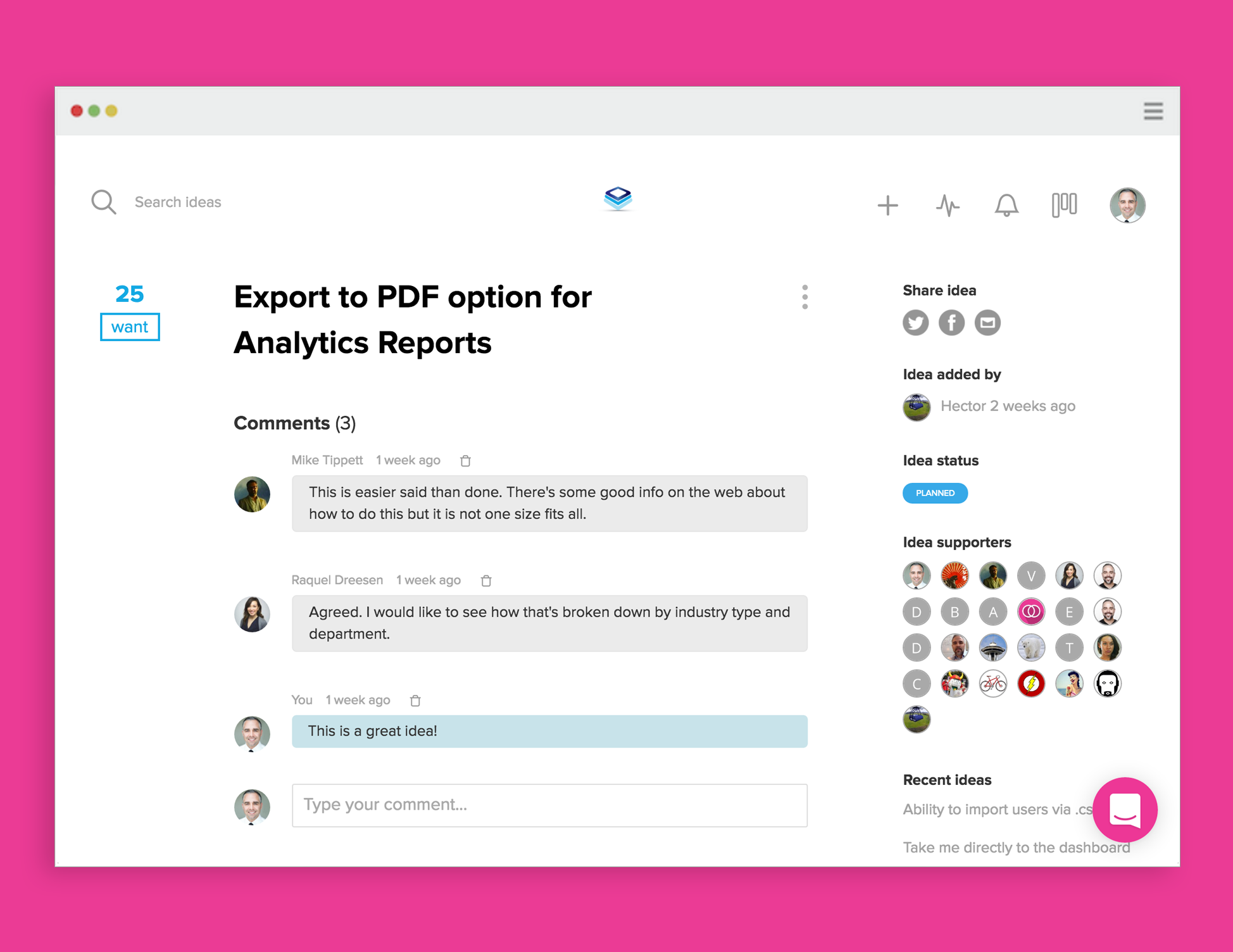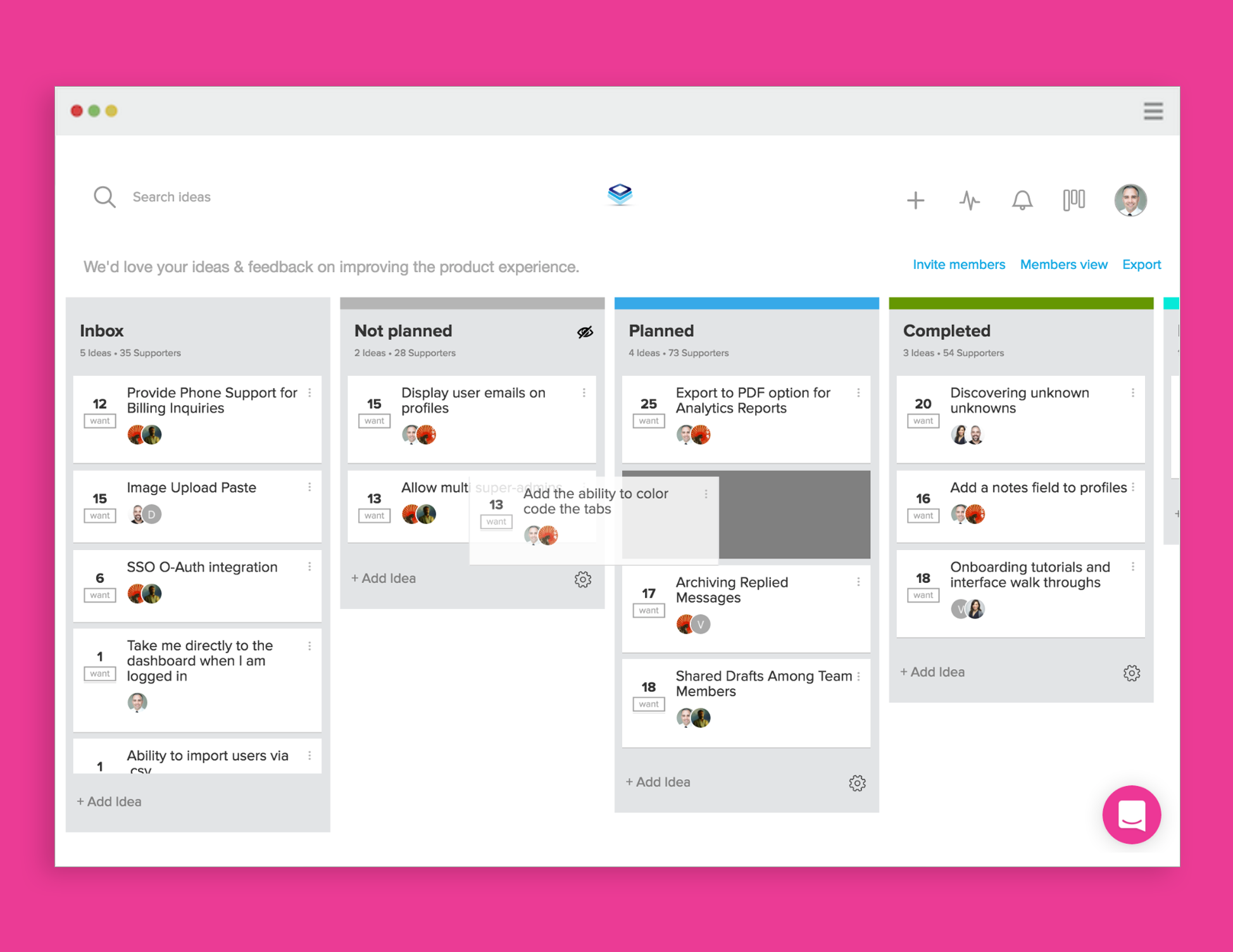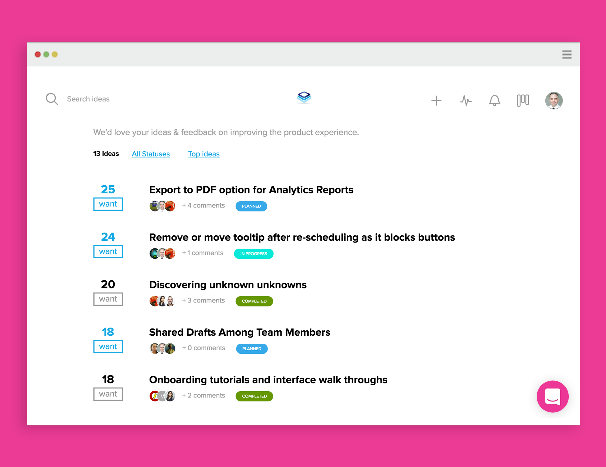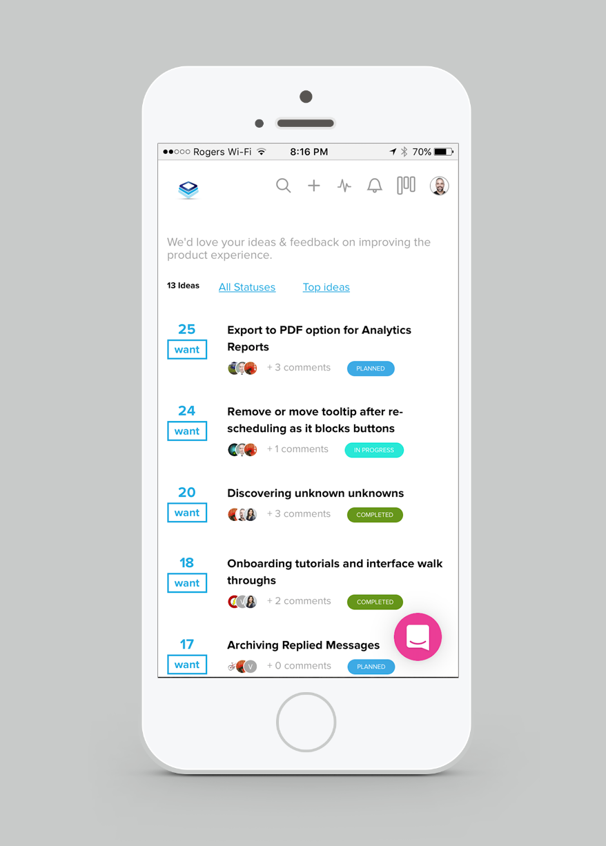 I've always had a tough time managing feedback on the many products that I'm creating. Wantoo takes care of that. The leaderboard functionality of collecting similar feedback feature along with the Trello board style approach to tackling what's next on the ToDo list.