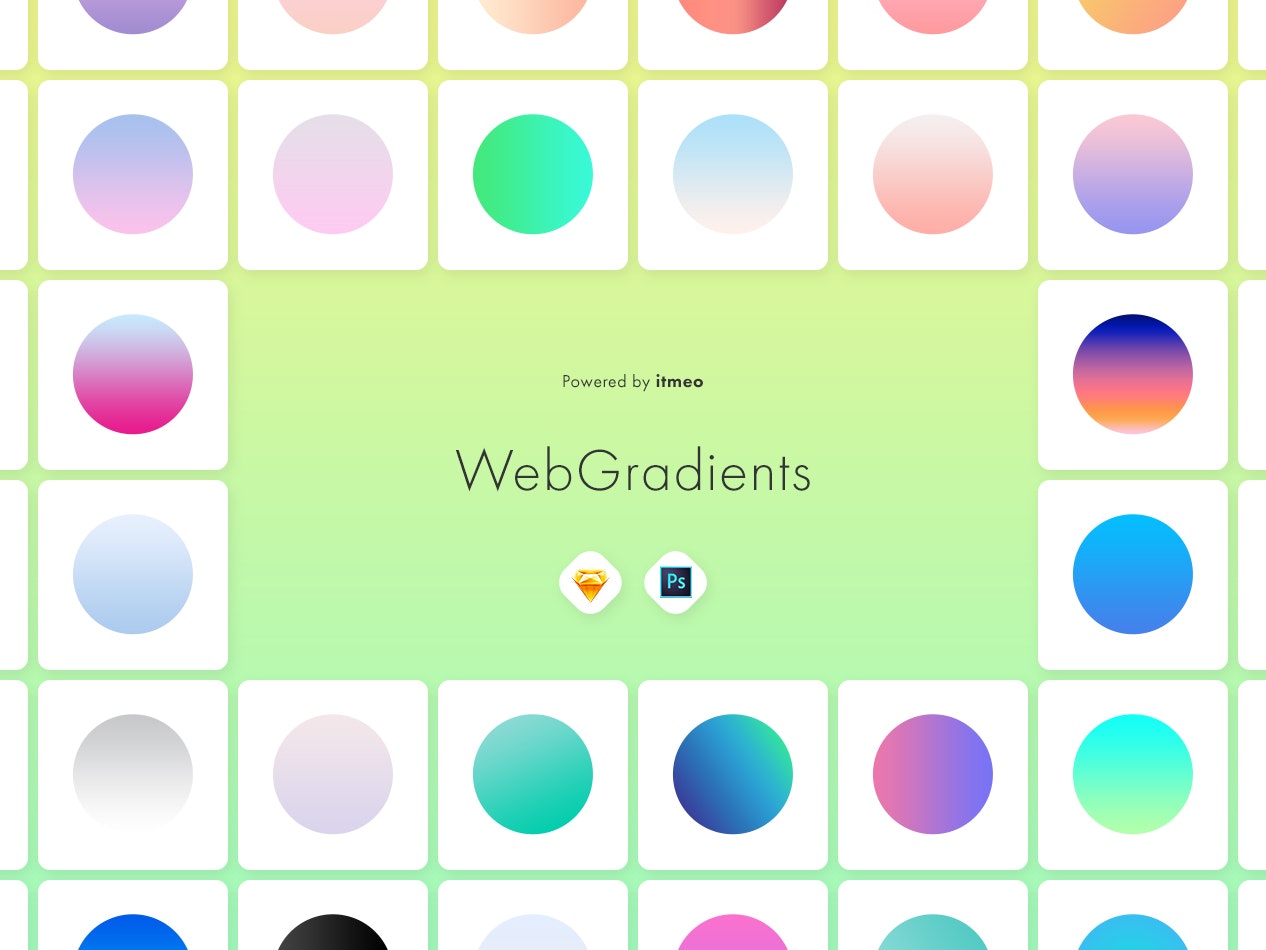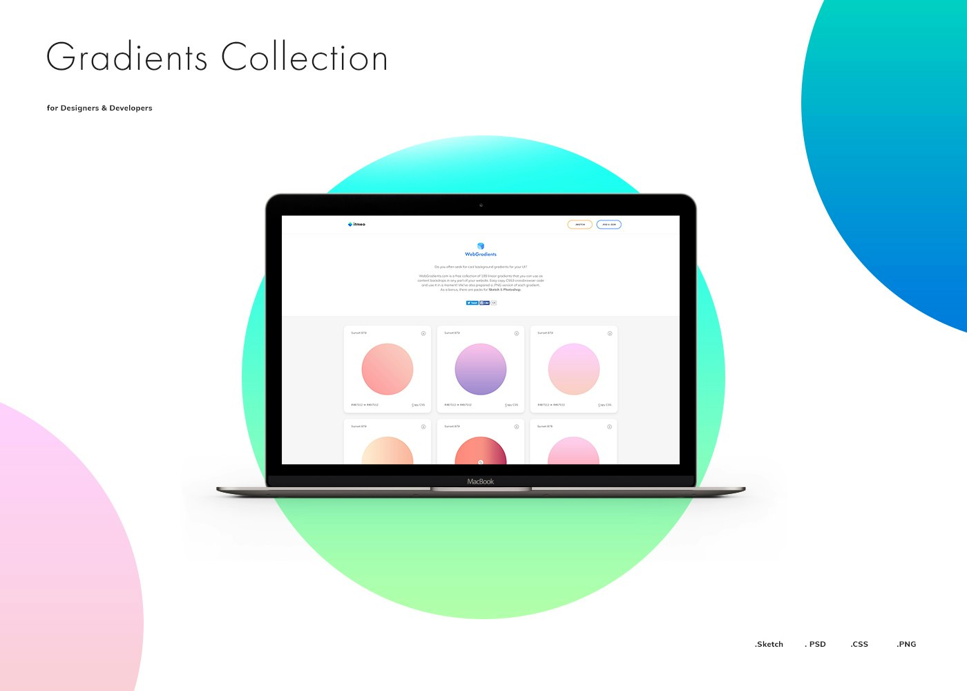 An ultimate gradients collection comes with ready to use Sketch and Photoshop files. WebGradients gives one-click access to CSS code making it a breeze to use the collection in your web project. As a bonus, you get high-quality PNG images of every gradients.