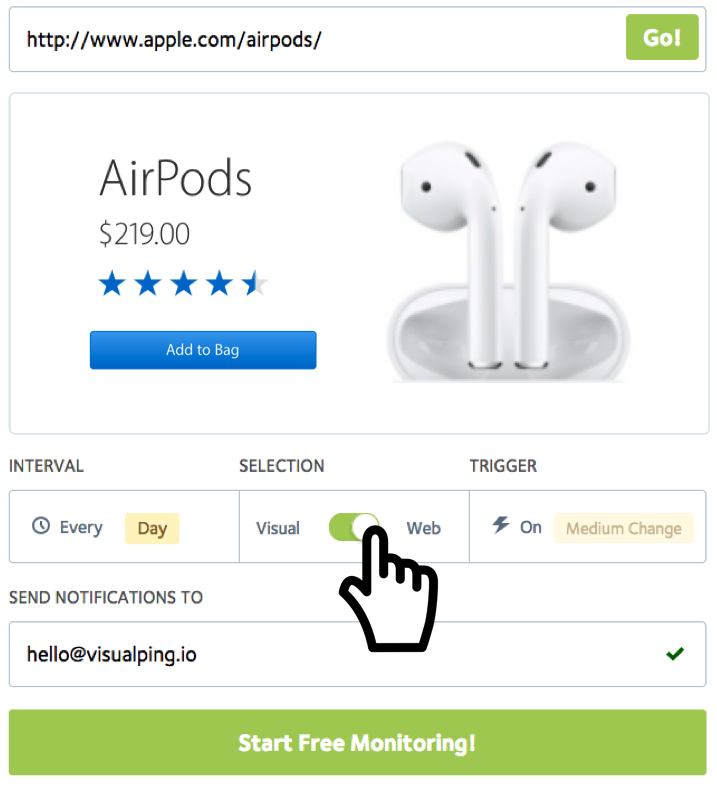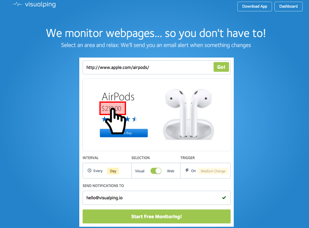 visualping is damn awesome, and this update is great. basically i can select an element on a webpage (in the graphic examples above, it's the price field of apple airpods) and then visualping will notify me when that element gets changed (i.e. the price changes).
