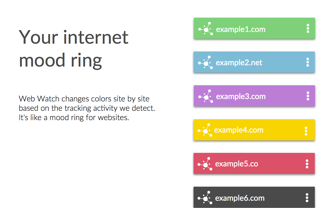 I'm Brad Johnson with WebAware. We're proud to introduce the Beta of our privacy extension Web Watch, a mood ring for websites that changes based on a site's tracking activity and a news feed of which trackers are on that site.