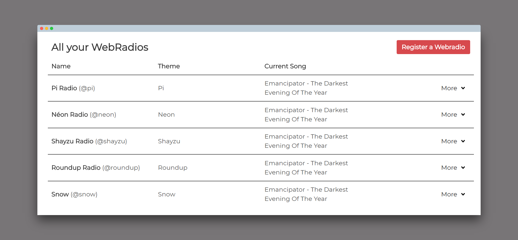 You can setup your webradio unique page in a few seconds and pick one of the available themes.