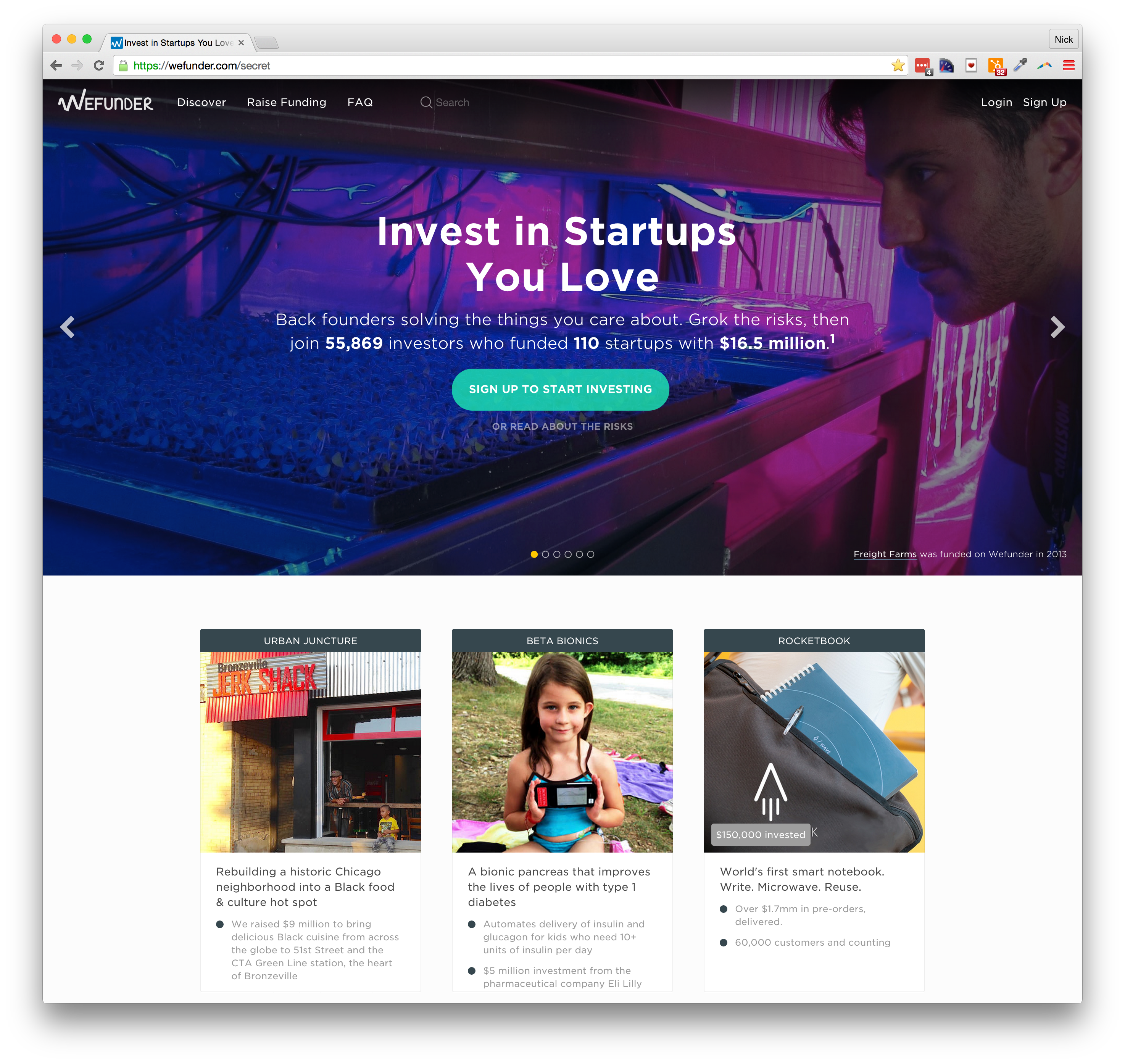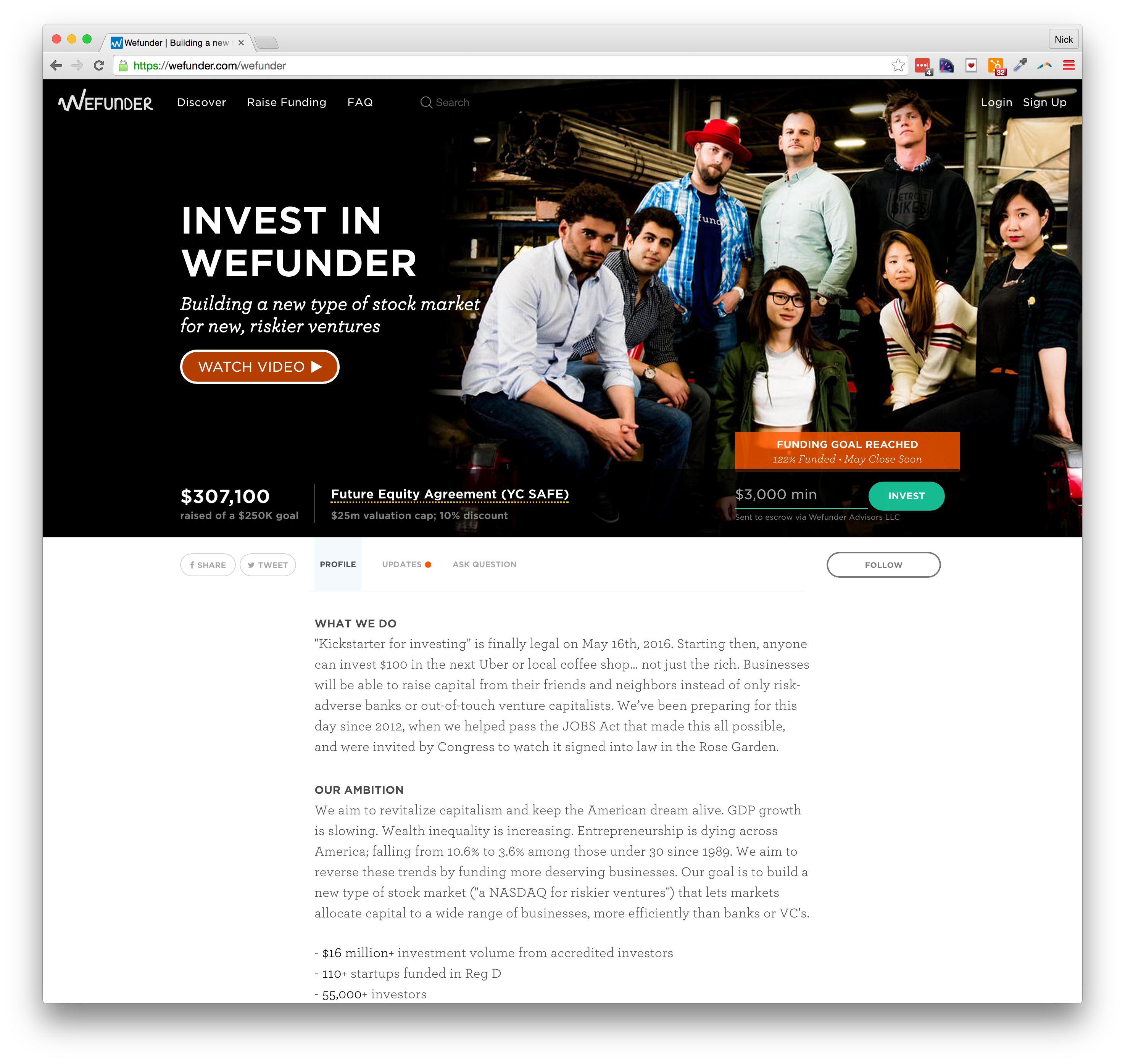 WeFunder's founder literally was one of the people who wrote the bill that hit the floor of Congress. Capital drives a lot of invention and innovation in the world, and what this ultimately means is that crowdfunding platforms like WeFunder can drive that much more good through the power of smart investors, software, and good dollars now from normal everyday… See more