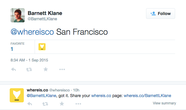 Interesting idea -- another invisible app. I just tweeted at @whereisco and it returned https://whereis.co/rrhoover.