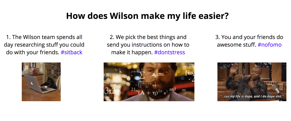 I've been using Wilson for the last few weeks and it's helped me get out. Normally, I wouldn't go through the extra effort of finding an event which is where Wilson steps in. I love services that deliver value immediately, Wilson is one of those.