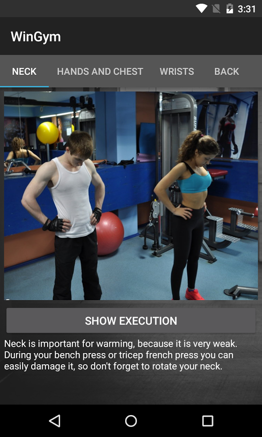 Hi! I'm the one of the creators of WinGym app. It is free, simple and clean gym exercise tracker for Androd, with great photos and descriptions. We also have a version for Windows Phone, which is called WinGym, also. Here is the link: https://www.microsoft.com/en-us/... It is not free at the moment, but we are working on that. :)