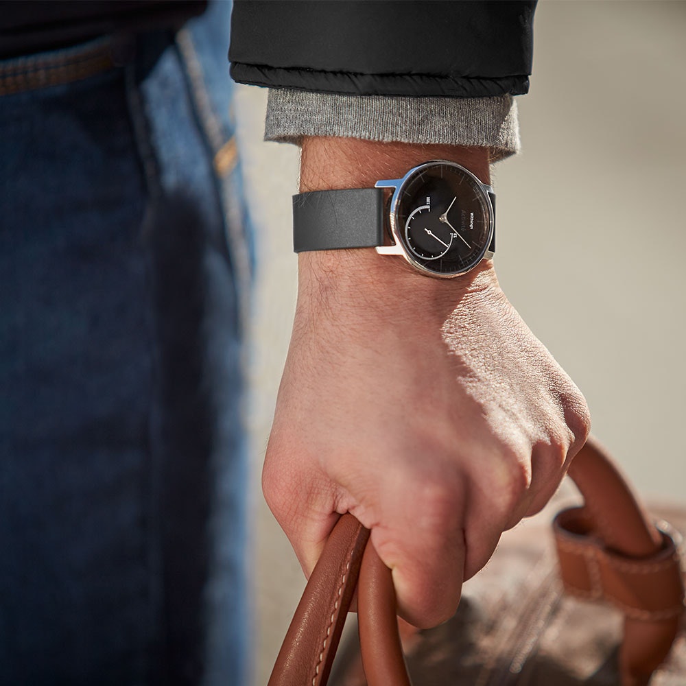 Activité Steel tracks your activity, steps, runs, sports, calories, swim session, but also your sleep cycles and wakes you you up with a silent vibrating alarm.
