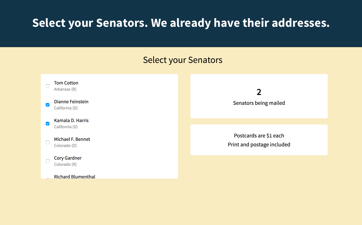 My co-founder and I have been building products in the on-demand print space for awhile, so we knew there was a better way. In the past 24 hours, we quickly built http://womensmarch.support. It lets anyone select their Senators and write a personal postcard to them using the Women’s March template. We’ll then print and mail it (we compiled the Senator’s addresses so you don’t have to).