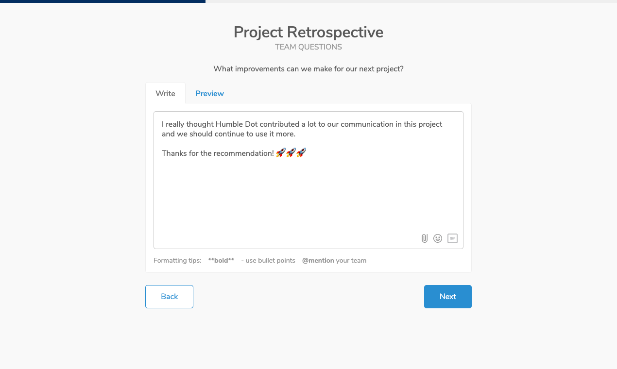 However, from talking with our users of the last year, we’ve been amazed to see how teams have customized Humble Dot well beyond our best practice templates to fit their specific processes and needs. We saw teams create check-ins from scratch to fit entire new use cases. These included things like project retrospectives, product feature brainstorms, feedback on interview candidates, and more.