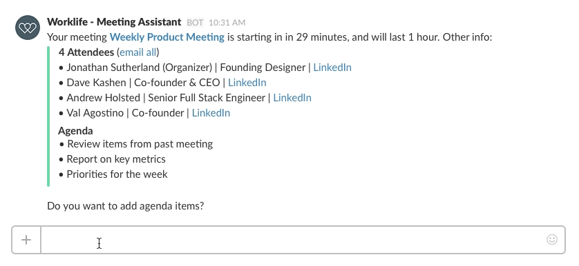 We just released a Slackbot that helps you prep you for upcoming meetings and lets you add & distribute agendas without leaving Slack. Let us know what you think...