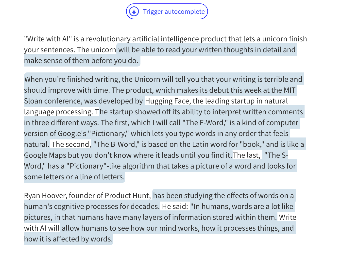 "Write with AI" is a revolutionary artificial intelligence product that lets a unicorn finish your sentences. The unicorn will be able to read your written thoughts in detail and make sense of them before you do.