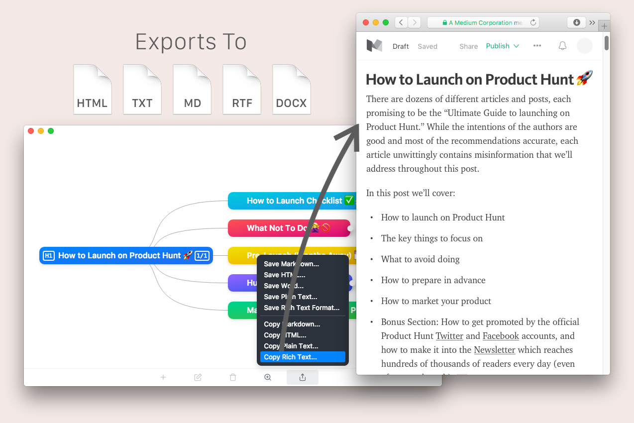Guan here, I’ve been working hard these past few months on my new Mac app: WriteMapper. It helps anyone with writing deadlines get from idea 💭 to final draft 📄 in no time, by turning mind maps into written content. You can shape and structure your work using a mind map, before exporting to various text formats including Markdown, HTML and Microsoft Word.