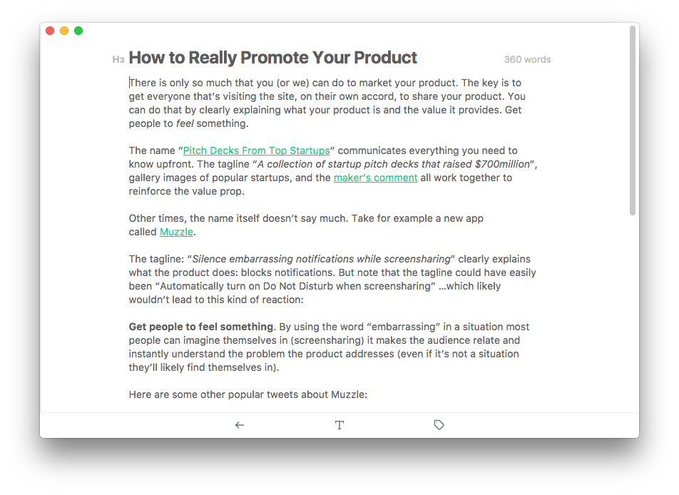 I do not use a Mac so cannot comment on the actual product, but on the concept. This workflow however looks incredibly interesting to test out. It just might make sense 1. outline in a mindmap 2. write little bits of stuff 3. get done. This may close the gap from outlining to writing - that is a useful problem to solve. I think a web app would make sense later down the road.