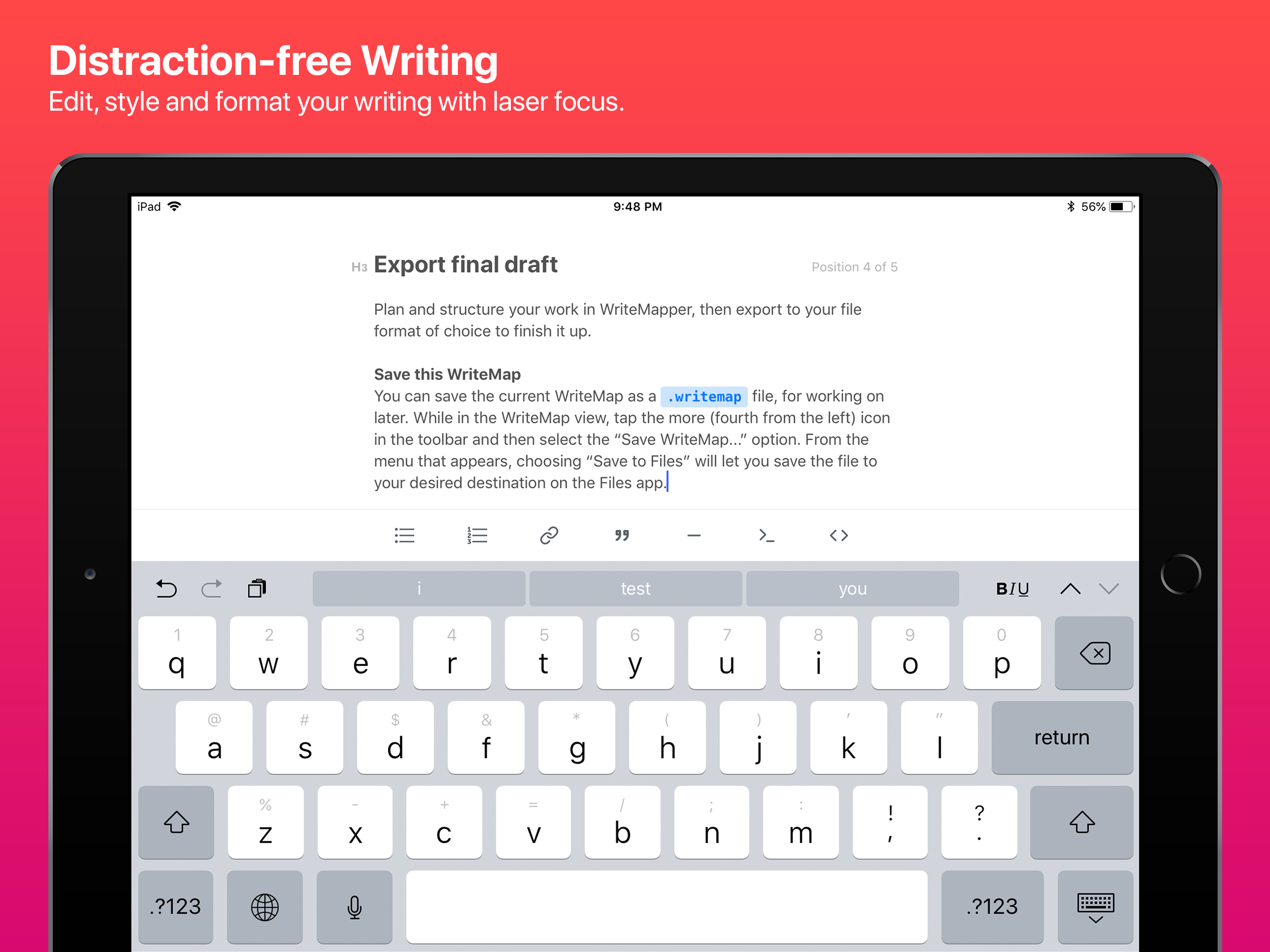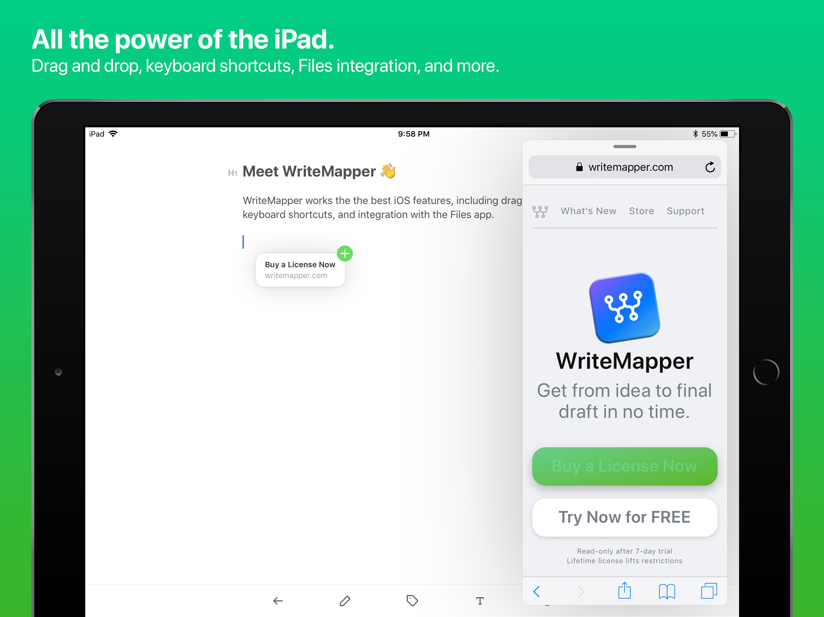 On top of bringing these writing productivity-boosting features to the iPad, WriteMapper additionally leverages the power of iOS to help you get your writing work done in no time at all, by integrating key platform features such as integration with the Files app, drag-and-drop interactions and extensive hardware keyboard shortcut support.