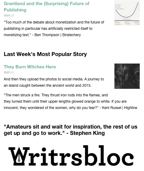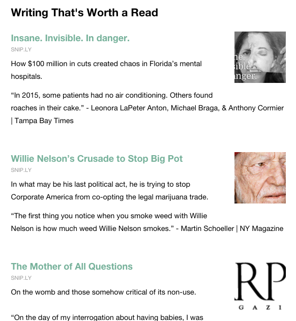 Hey everyone! Happy to share this little side project with you all. Since March, I've been compiling and sharing a weekly list of can't-miss stories drawn from sites across the web. I do my best to feature things both deservedly viral and off the beaten path. We live in the golden age of content, but there's simply too much of it to go around. Some great sol… See more