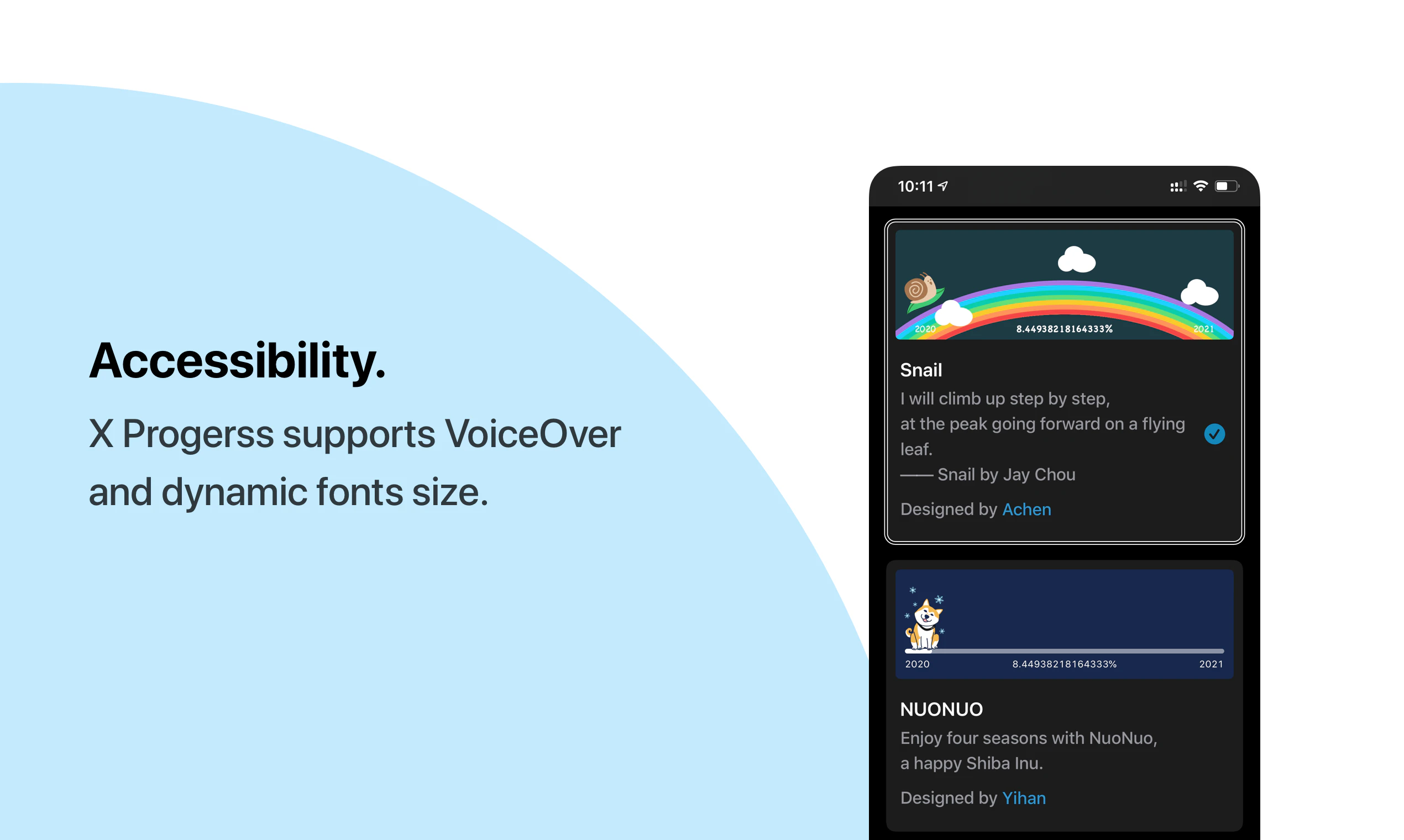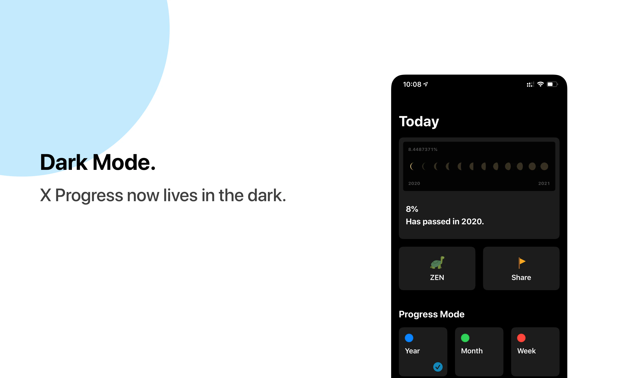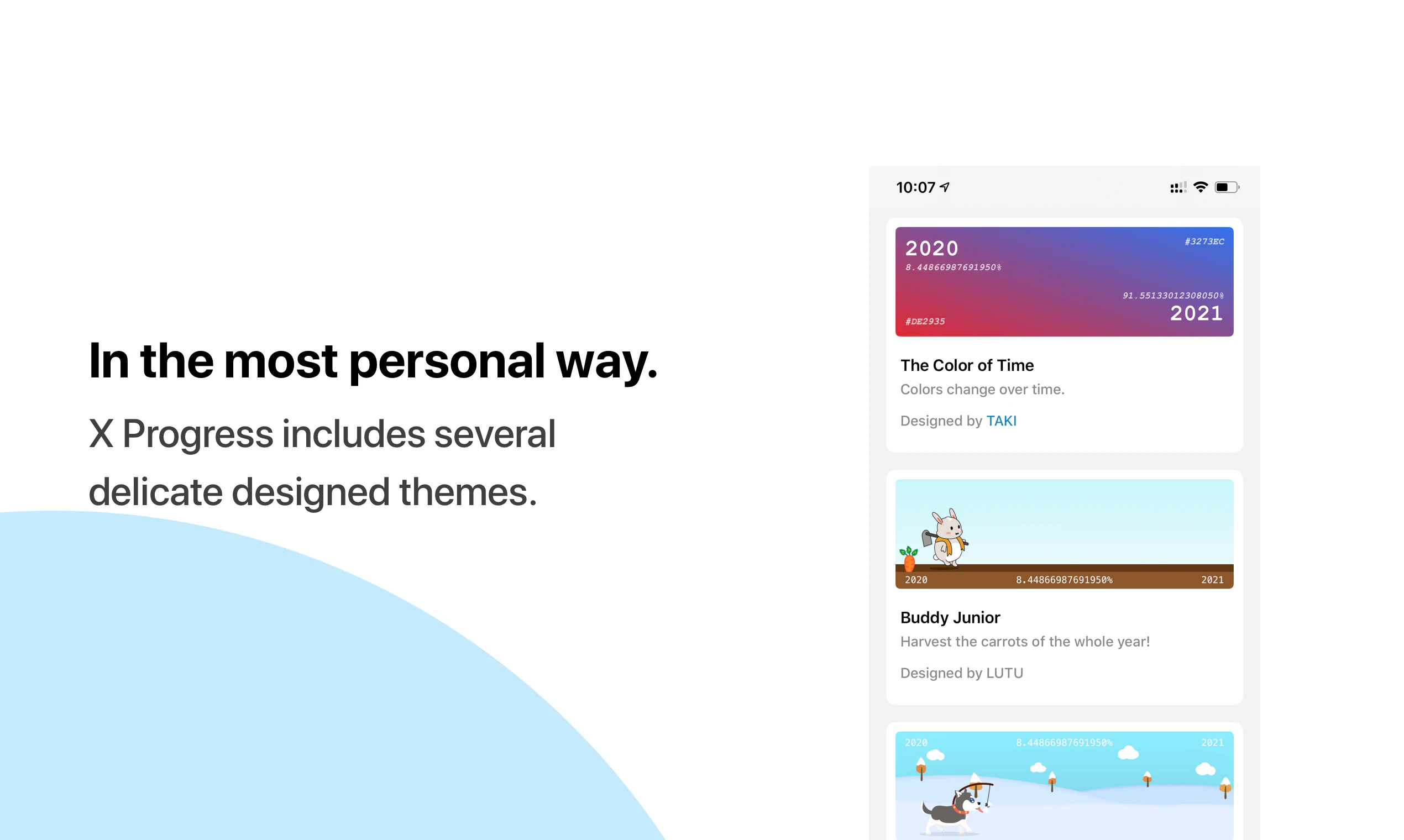 X Progress is an app that can help you track the progress of the current year, month, week, or any other custom events. X Progress includes several delicate designed themes, supports iCloud sync, Dark Mode, VoiceOver. macOS version also provided (Second link).