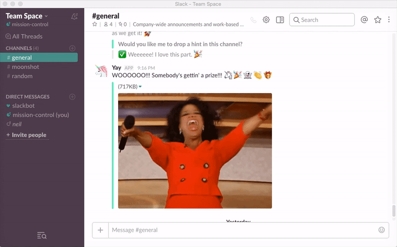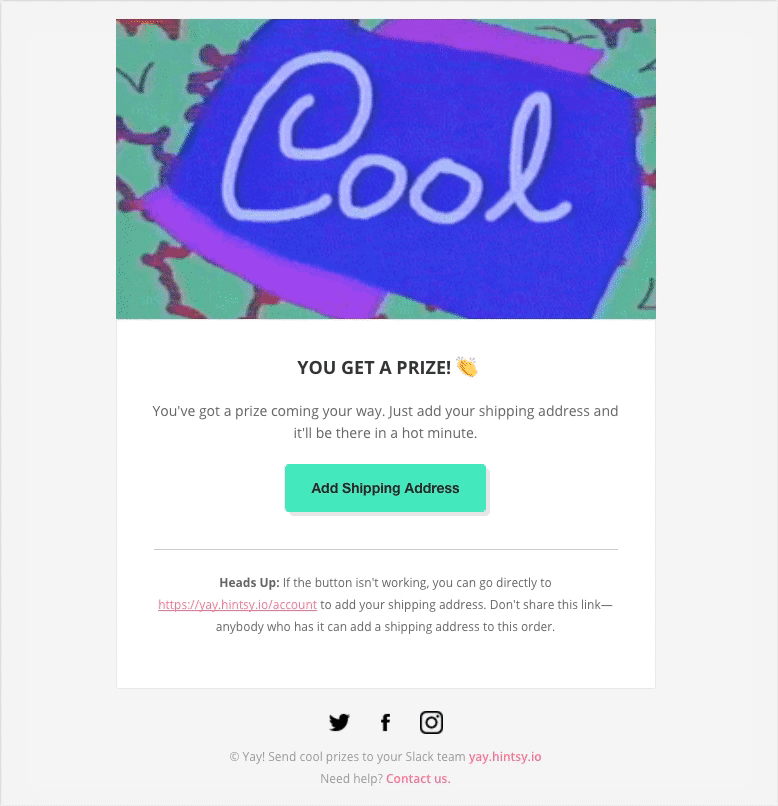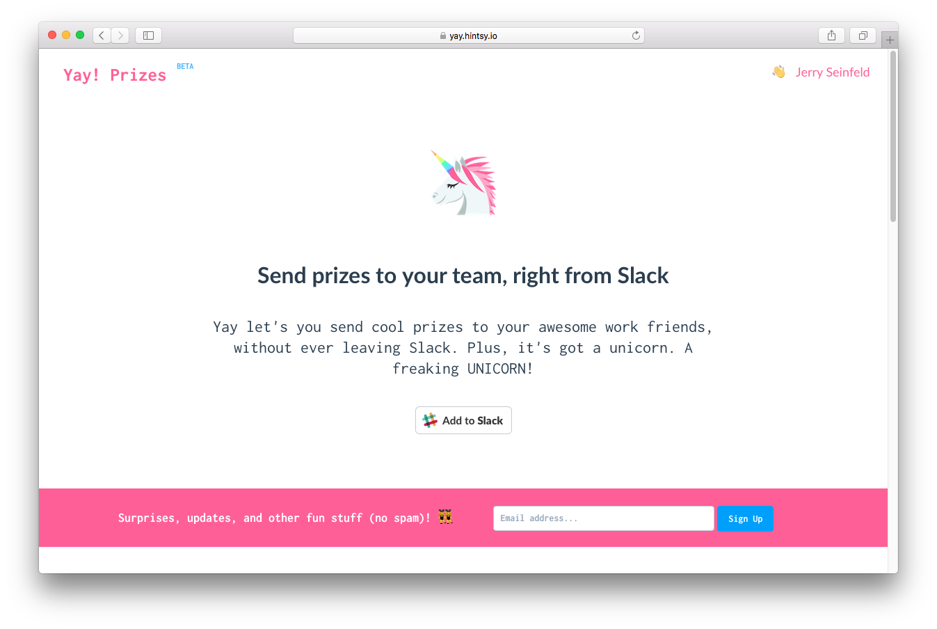 Yay helps you send cool prizes to your team, without ever leaving Slack. Just use the /yay slash commands and @ mention a Slack friend, and a unicorn bot will coordinate the delivery. It's great for te… See more