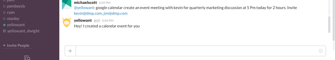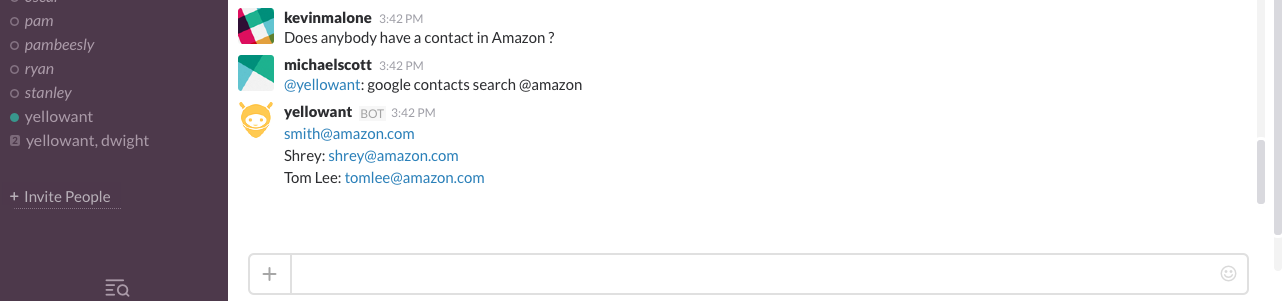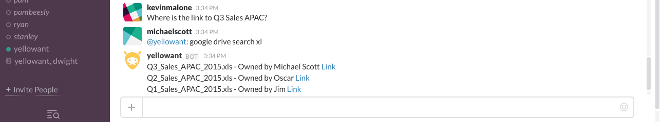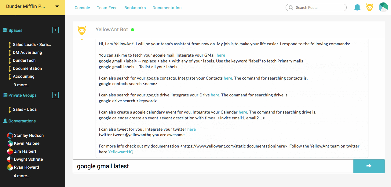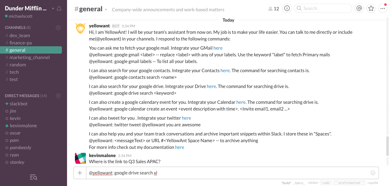 Vishwa, Co-Founder of YellowAnt here. YellowAnt is an assistant bot for teams that helps you manage all your workplace apps through simple commands. The YellowAnt makes sure that you don't miss out on any updates relevant to you at work, so that you can focus on the important stuff - build… See more