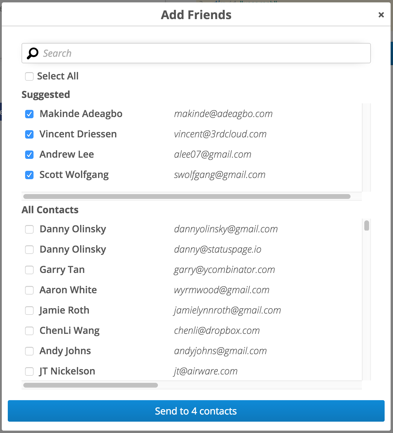 I led the original version of this at Dropbox; well done on turning it in to a service. Quick tip for sorting: matching last name (family) and taking recency more into account will probably increase count/send rates ;)