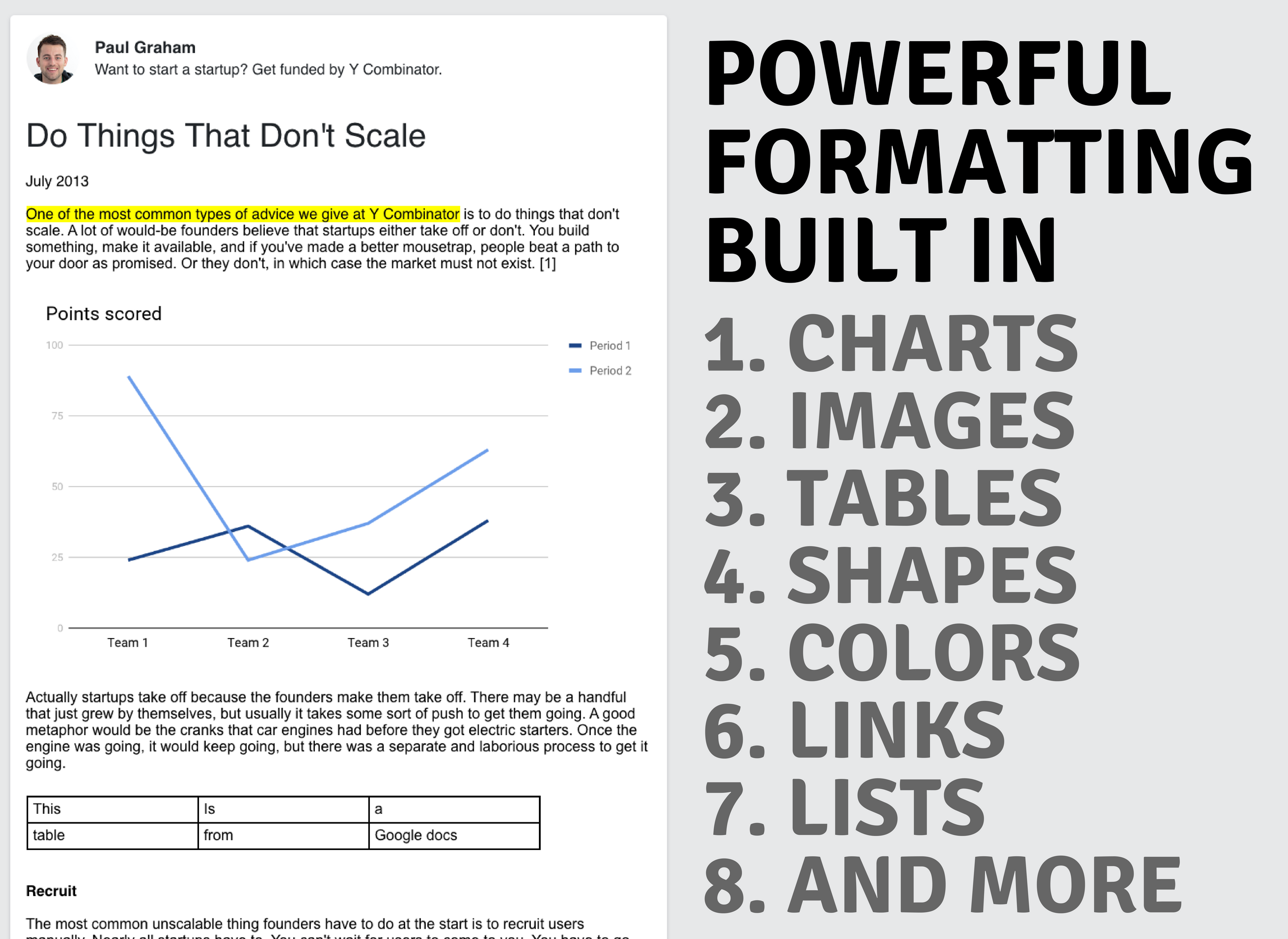 Cool example: Export native gDocs charts, tables, formatting with ease: https://www.youdontneedwp.com/pa...