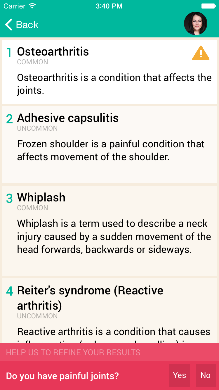 3. Just like a doctor, Your Mobile Doctor asks follow-up questions (up to 3 questions) to improve the accuracy of the results