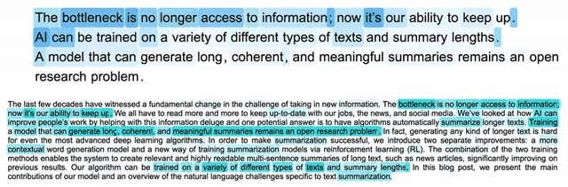 Summarization of text by an AI is the next frontier in natural language processing / understanding. MetaMind, acquired by Salesforce last year, just showed a demo of their tech in action. It's amazing!