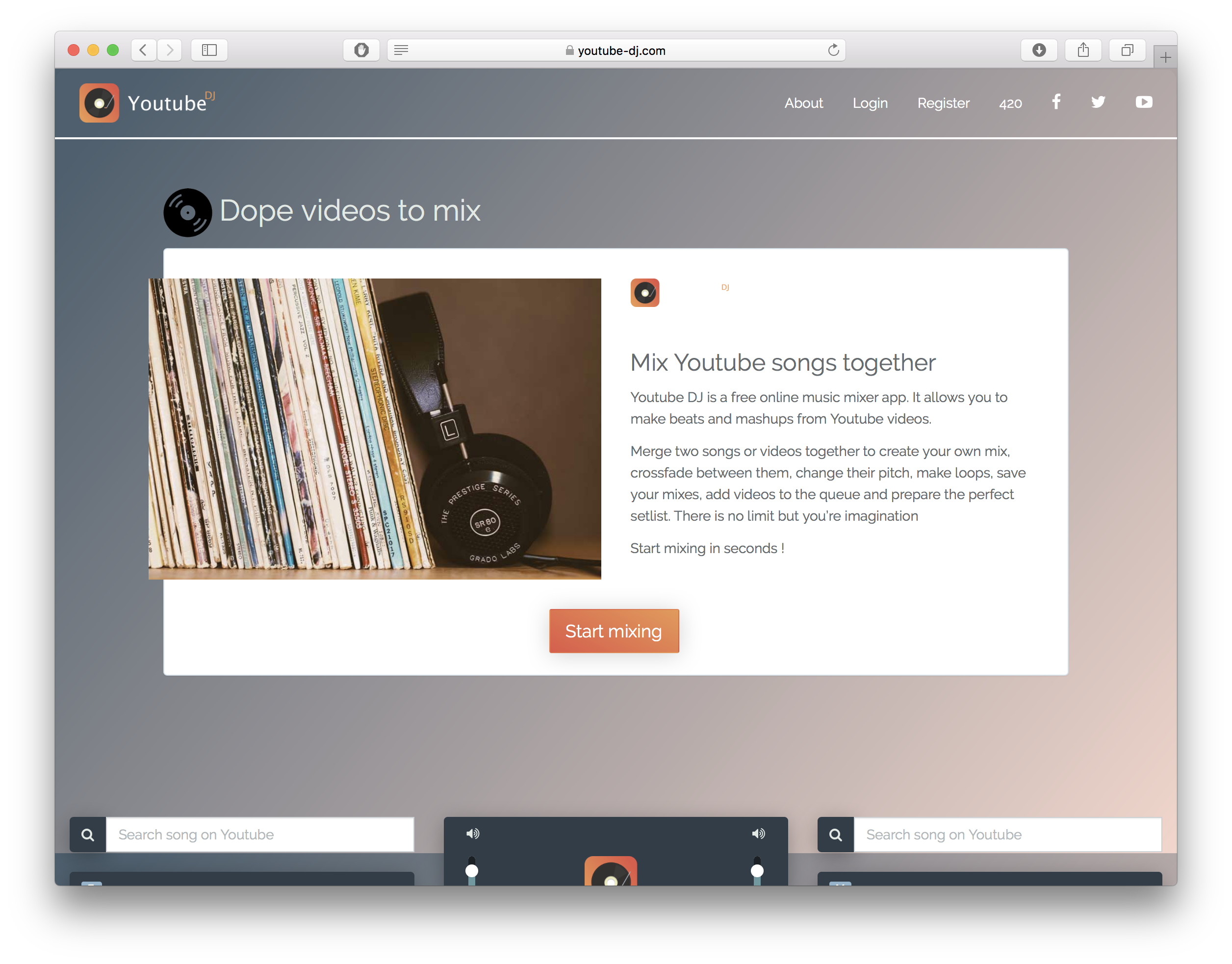 On Youtube DJ, you can search for songs, acapellas and instrumentals on Youtube, control the speed of the tracks, make loops, slow down the vinyl by clicking on it and even scratch with your keyboard. Hundreds of mashups already have been created by the community.