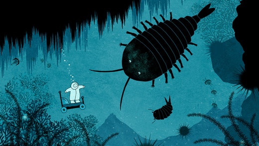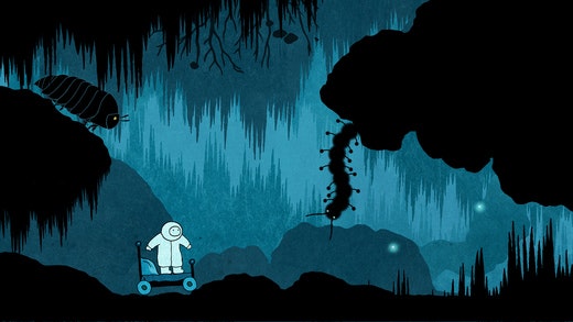 The small, courageous explorer rides on his bed on casters in this fantastical and mysterious place.