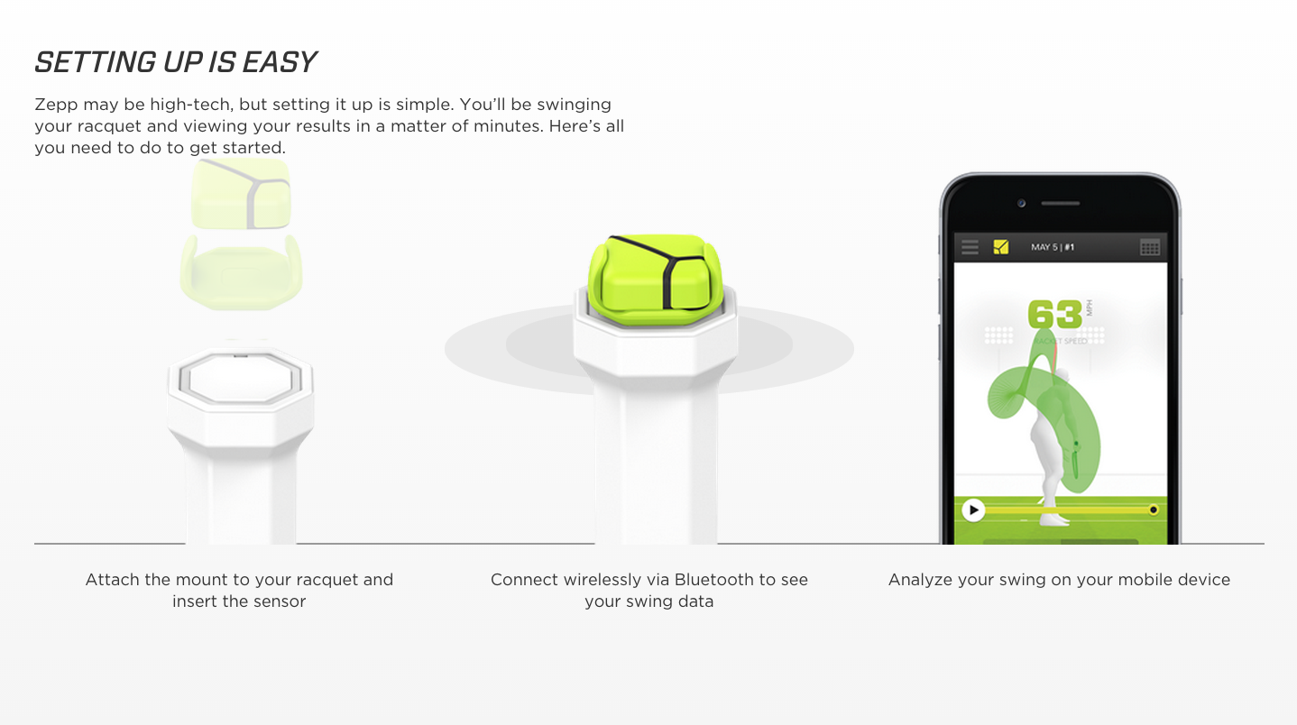 "Using a sensor attached to the butt of a racket, Zepp can track racket speed impact, ball spin, backswing time, impact time and more that then transfer that in real time to an app for coaching help." http://www.si.com/tennis/2015/05...