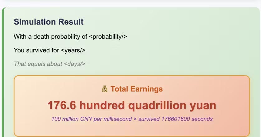 1esurvival tunes per-second death odds, forecasts survival years and earnings, compares risk tiers, and surfaces global leaderboards plus Zhihu's 100M dilemma.