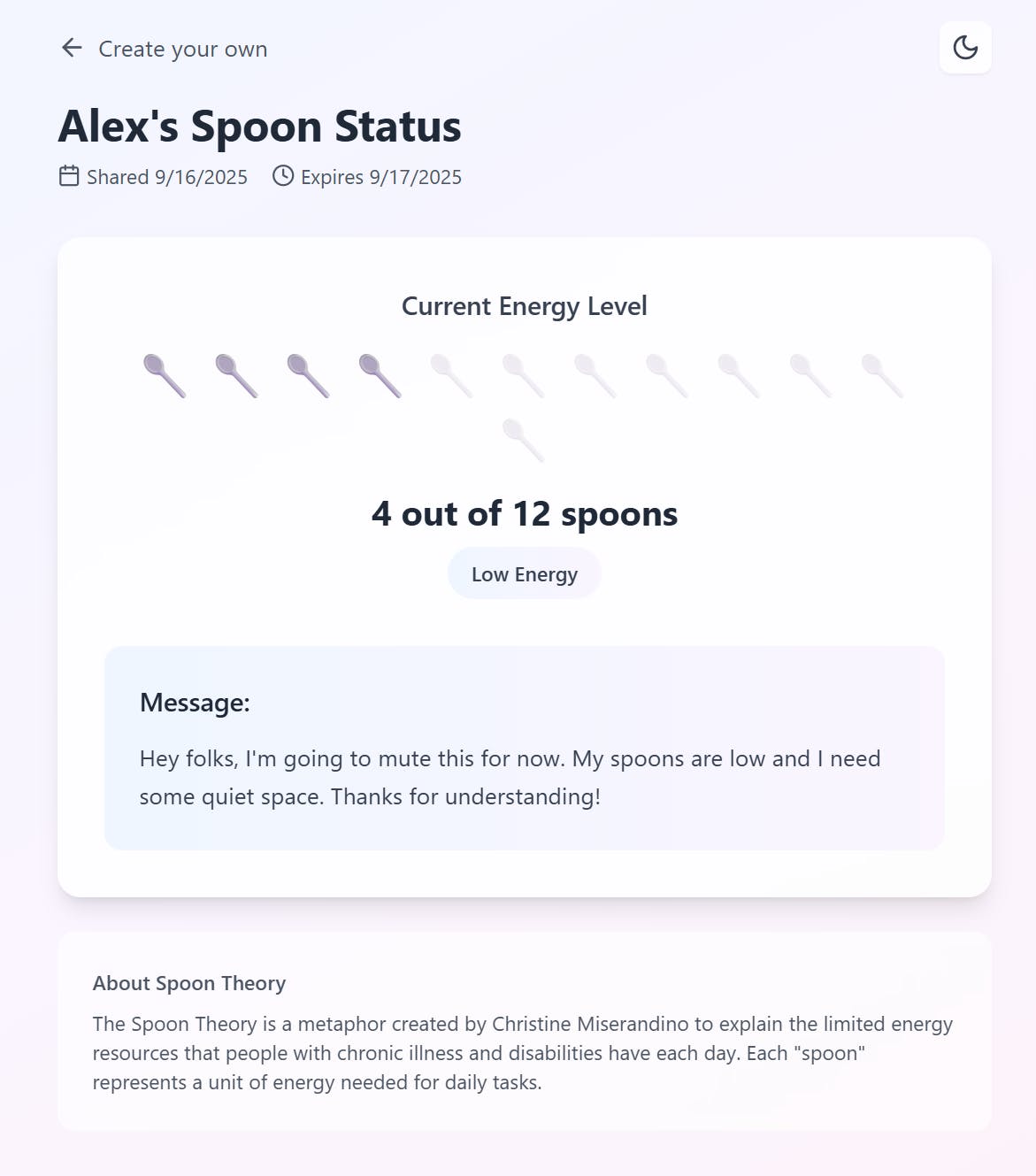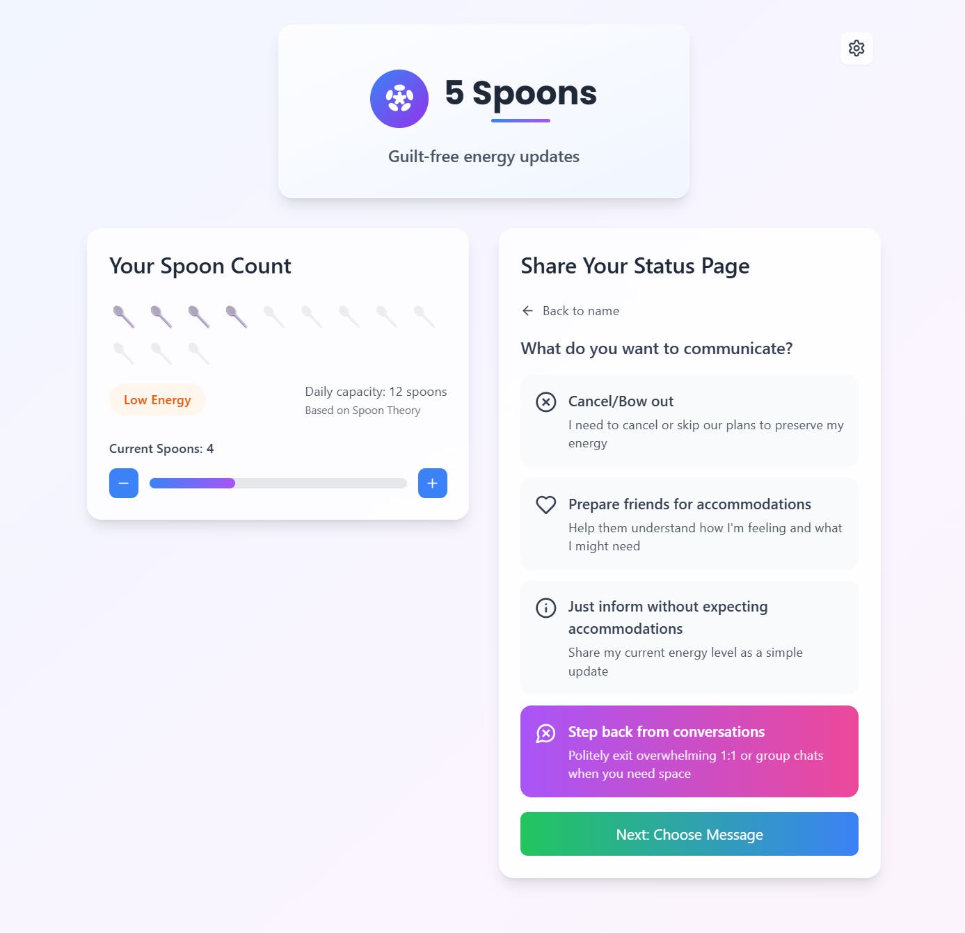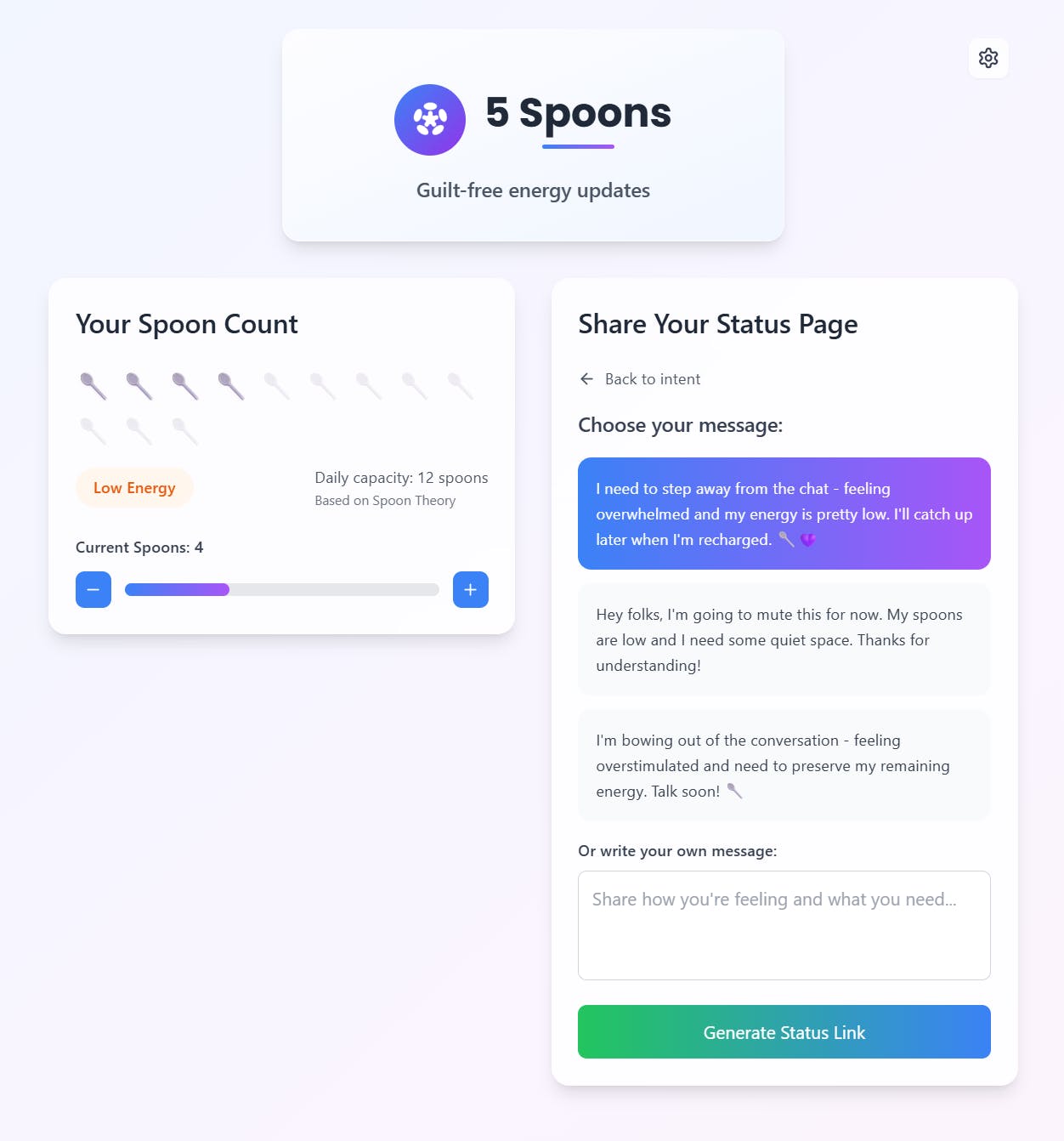 5 Spoons is a free tool that helps neurodivergent individuals, and people with chronic illness or disabilities, communicate their energy levels and set healthy boundaries, clearly and kindly.