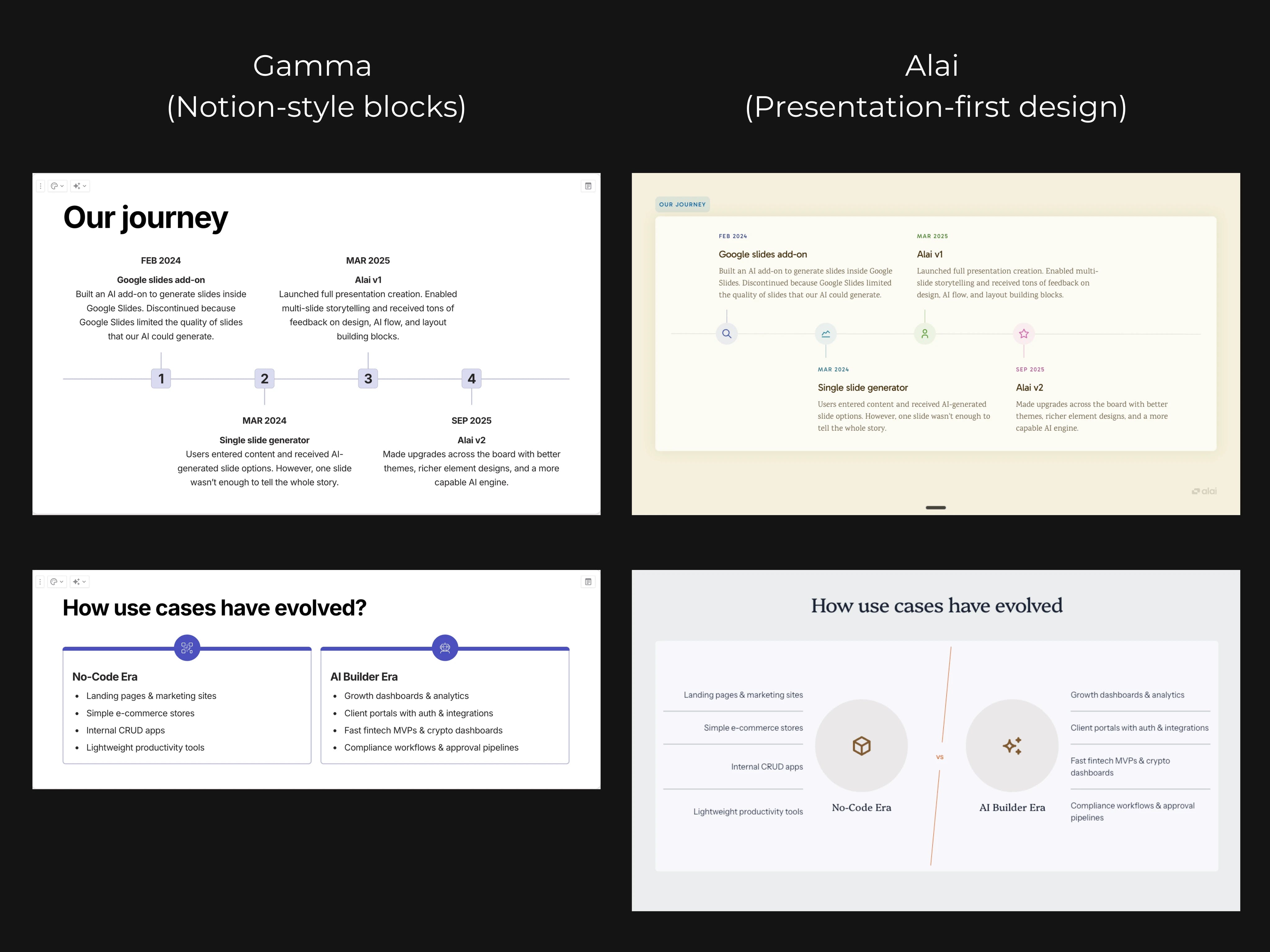 Great question! Gamma is multi-format and uses simple Notion-style blocks that look flat and generic. Alai is presentation first and so the elements look premium with a lot more flexibility.