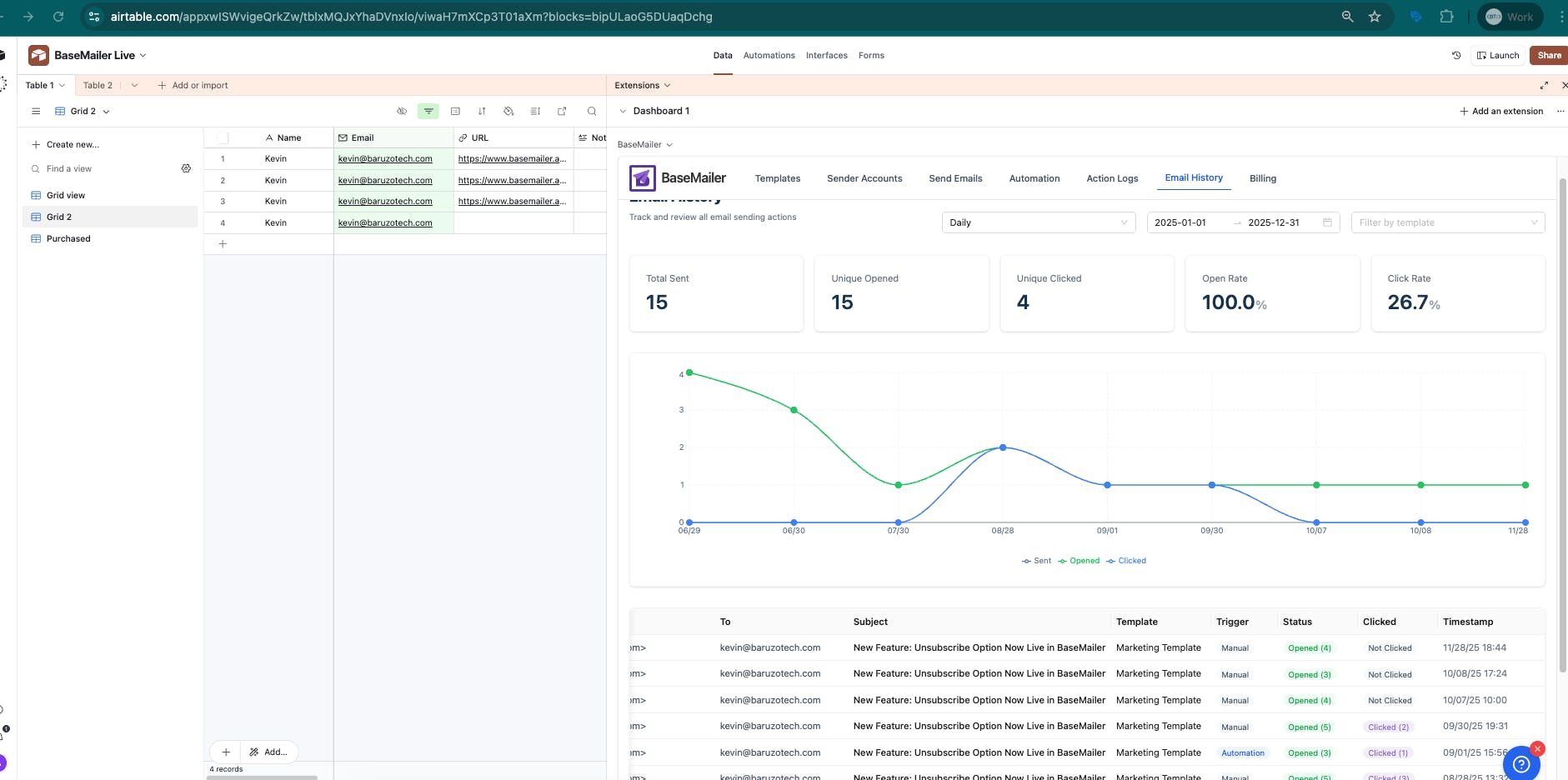 BaseMailer makes Airtable email marketing easy for everyone. You can design, send, and track personalized bulk emails without ever leaving your base. Our simple drag-and-drop builder helps you create beautiful emails in minutes. Use your own Gmail or Outlook account to scale your Airtable email automation and get real-time results. No more messy CSV exports-just powerful tools to help you grow. Start for free today!